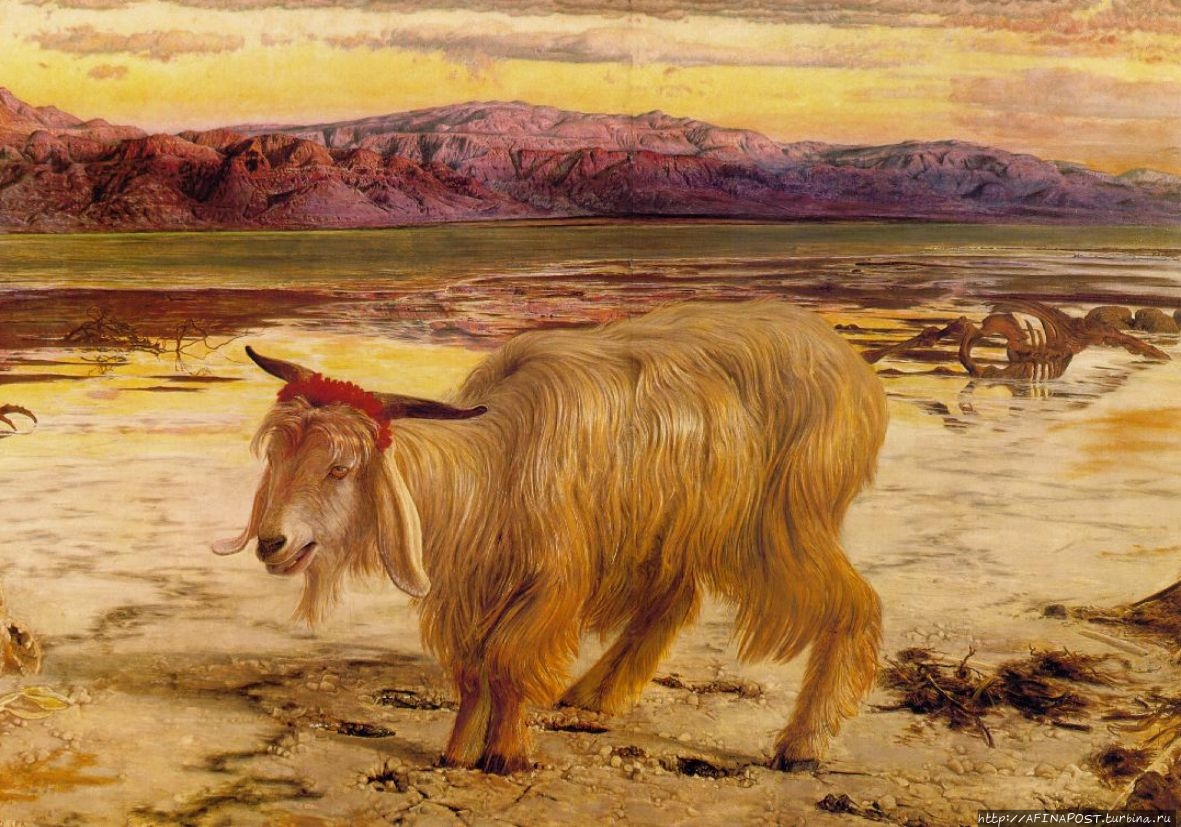На ней только зловещая, ослепительно яркая, похожая на страшный сон соляная пустыня, в её роли выступило Мертвое море, то место, где стояли Содом и Гоморра. Его Хант, естественно, писал с натуры, как и самого козла. Согласно Ветхому Завету, козел отпущения – это животное, которое выбирали для ритуала очищения общины: на него возлагали грехи всех людей общины, а потом выгоняли в пустыню.