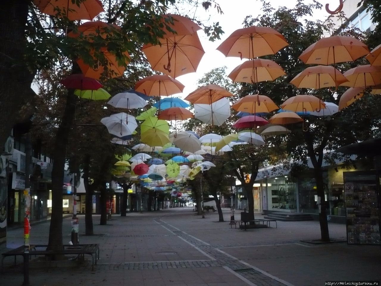 По старой, доброй привычке проснулся незадолго до рассвета, и отправился знакомиться с новым для меня городом. За 45 минут многого не увидишь, но хоть пару-тройку достопримечательностей посмотреть можно. Маленький городок в этих местах появился на рубеже IV века до нашей эры, здесь зарождалась фракийская цивилизация. На протяжении веков это был маленький заштатный городок с небольшим населением. В начале ХХ века в городе проживало чуть больше 6000 человек, в большинстве своем турецкого происхождения. Первое электричество появилось в 1929 году, а водопровод в 1934 году. В десяти минутах ходьбы от отеля находится пешеходная улица Тодора Александрова. Здесь сосредоточены все увеселительные заведения города. Знакомые зонтики между домами.