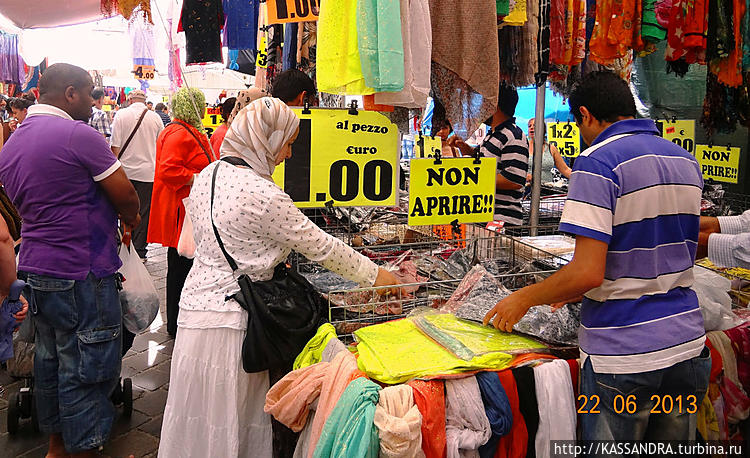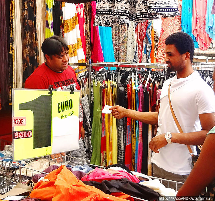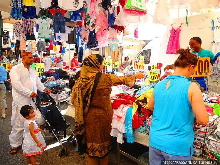 Цены на уличных рынках, как правило, бывают ниже чем в магазинах. На этом рынке мы встретили фантастические распродажи одежды, сумочек, джинсов и косметики по действительно смешным ценам от 1 евро.