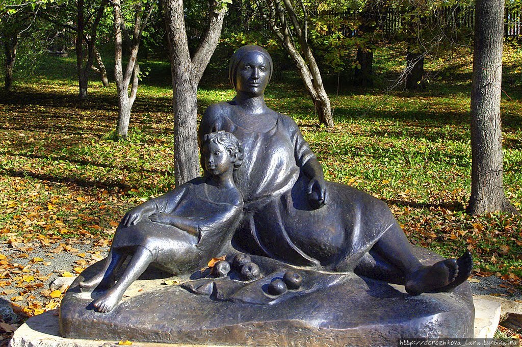 У здания музея-заповедника сидит на скамеечке в лёгкой блузе А. С. Пушкин Автор памятника — скульптор О. К. Комов, архитектор — супруга скульптора Нина Ивановна Комова (1979 год).