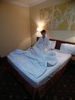 Номер люкс – это две светлые и просторные комнаты. Есть большая взрослая кровать, раздвижная детская кровать (мои мальчики оба на ней уместились) и вся остальная необходимая мебель. Также в наличии два телевизора, холодильник, чайник и чашки, фен, халаты, косметические принадлежности…
