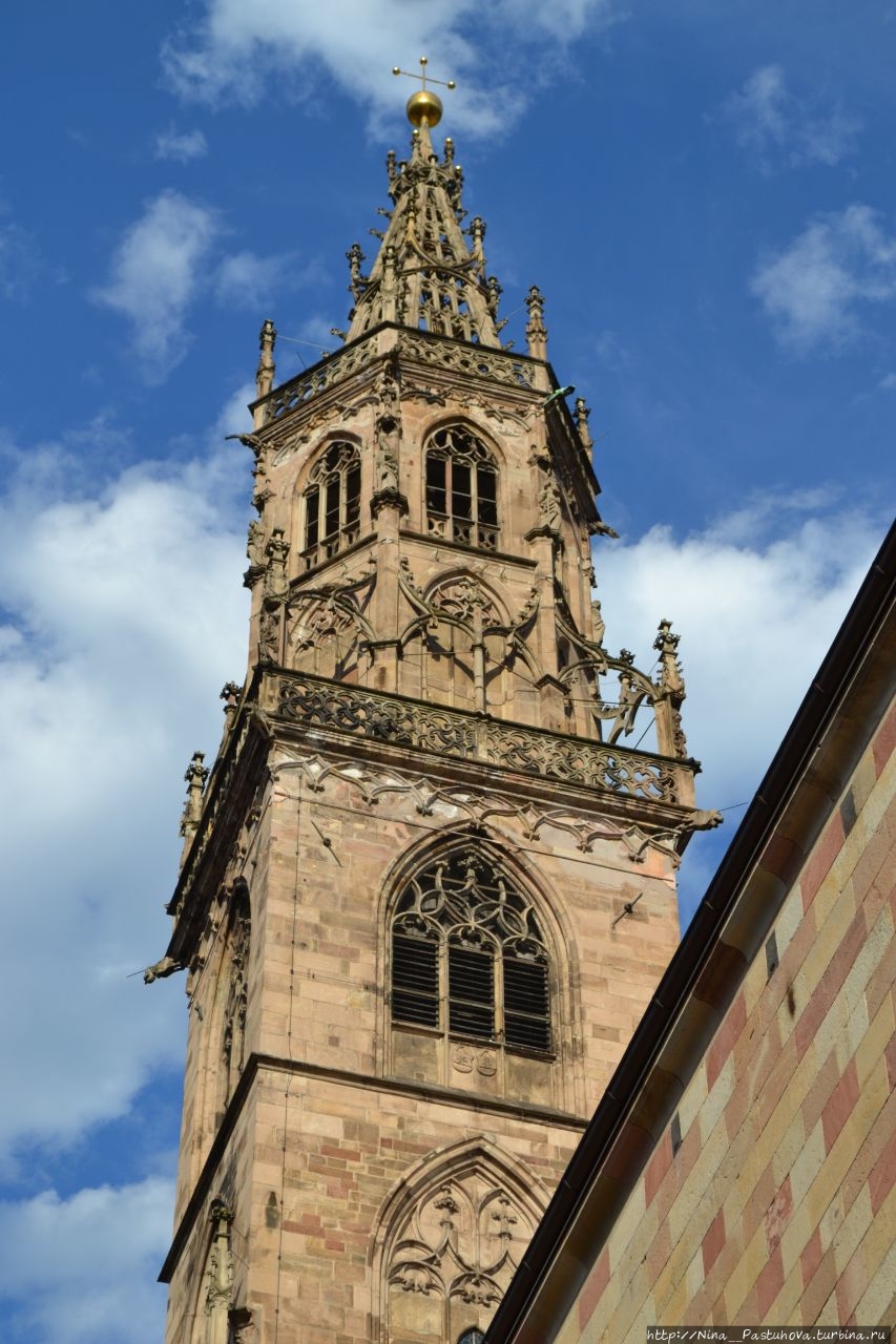 Смотрю, куда же направлен взор миннезингера Вальтера? А взгляд его устремлён на одну из главных достопримечательностей города — Кафедральный собор Успения Девы Марии (Cattedrale di Santa Maria Assunta). Он является образцом слияния культур Италии и Германии. В его архитектуре смешались романский и готический стили: строгое без излишеств строение, выложенная цветной черепицей крыша с бело-черно-желтым орнаментом на изумрудном фоне, филигранный рисунок высоких окон и почти воздушная готическая колокольня с тонким шпилем. Каждый элемент которого сужается и тем самым создает ощущение высоты. Кажется, что его филигранная крыша просто уходит в небо.