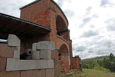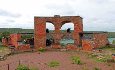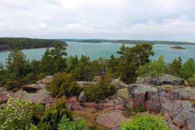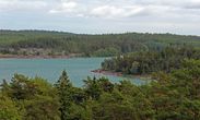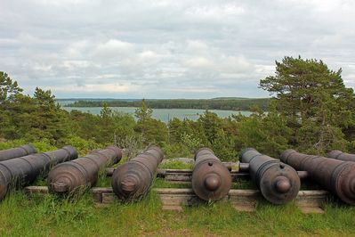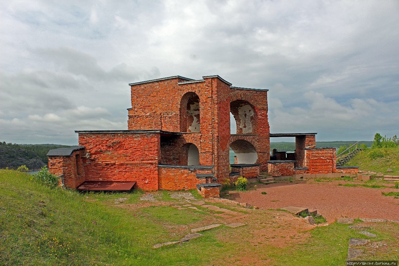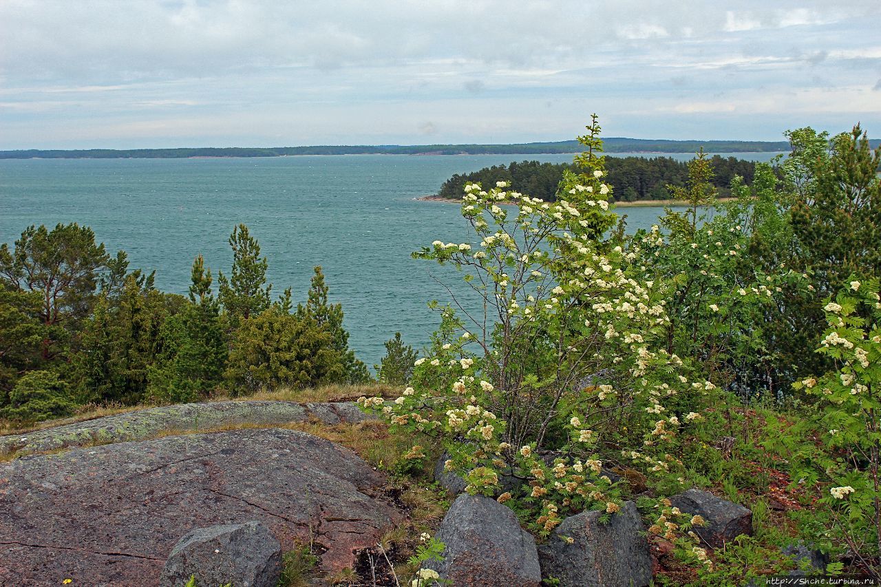 Находясь на вершине Дьявольской горы Дьявольская гора - однозначно лучшие панорамы Аландов, мы заметили на краю соседнего полуострова военного фортификационного сооружения.