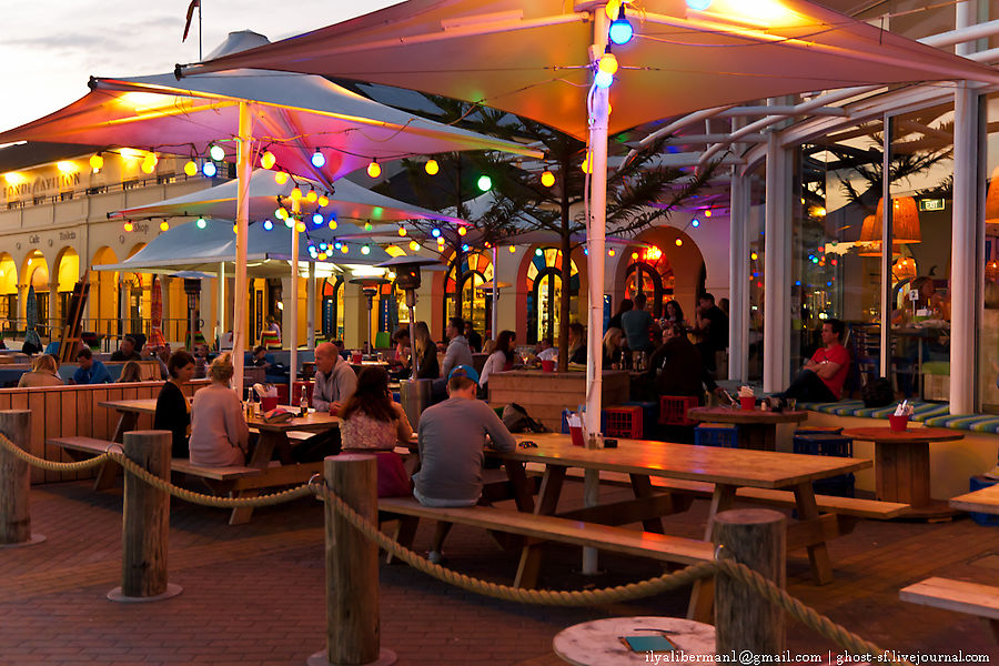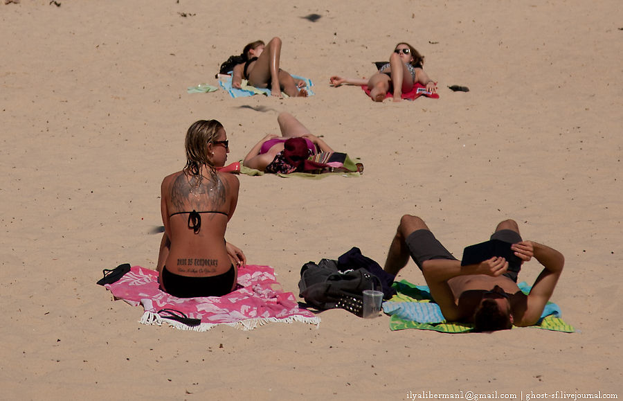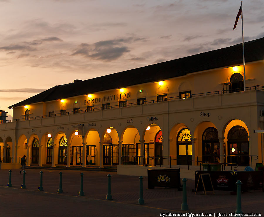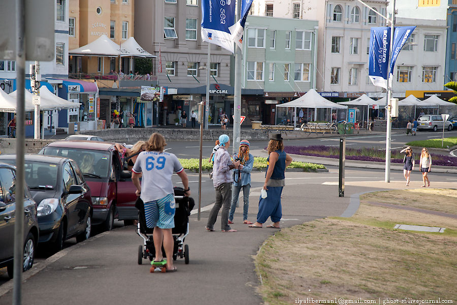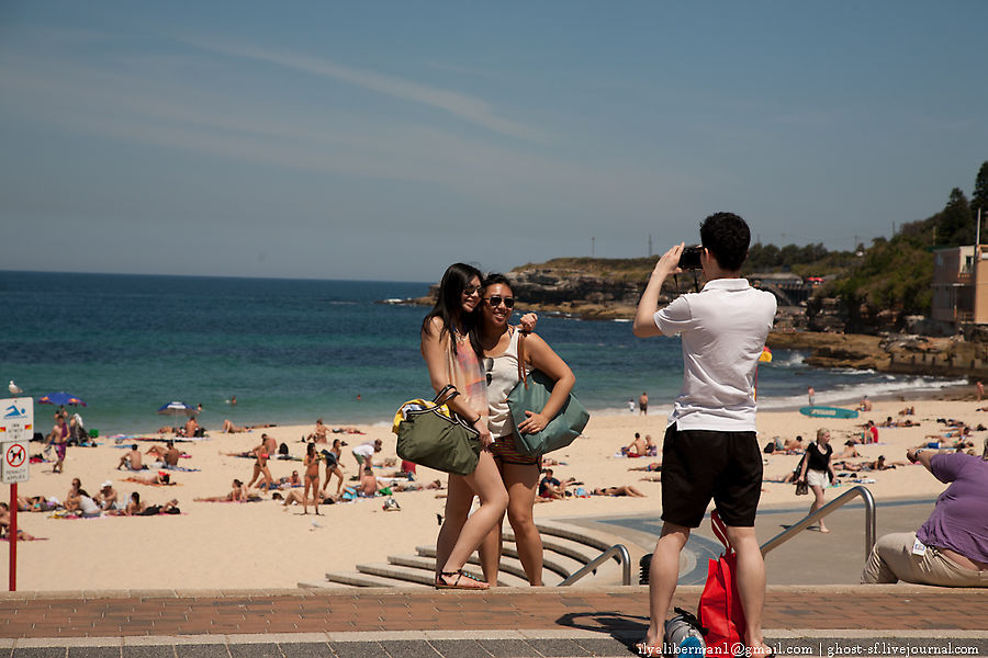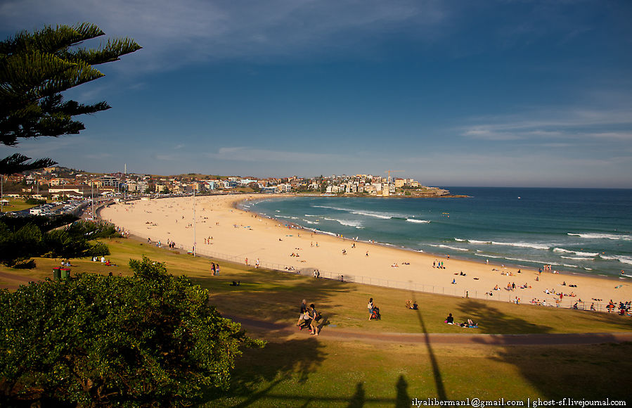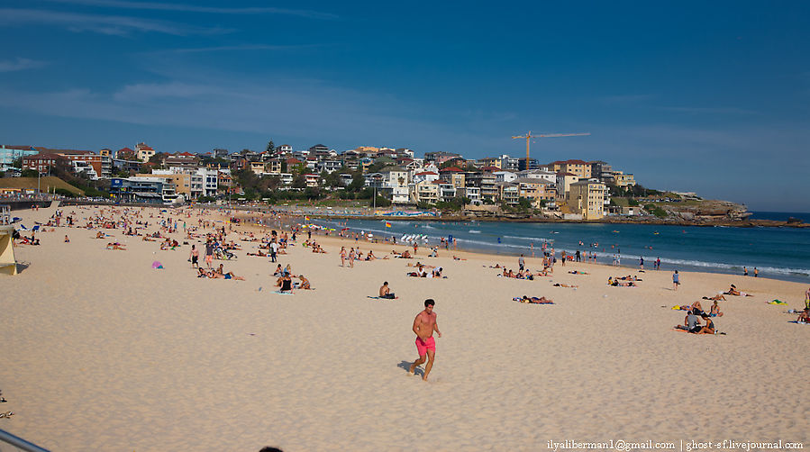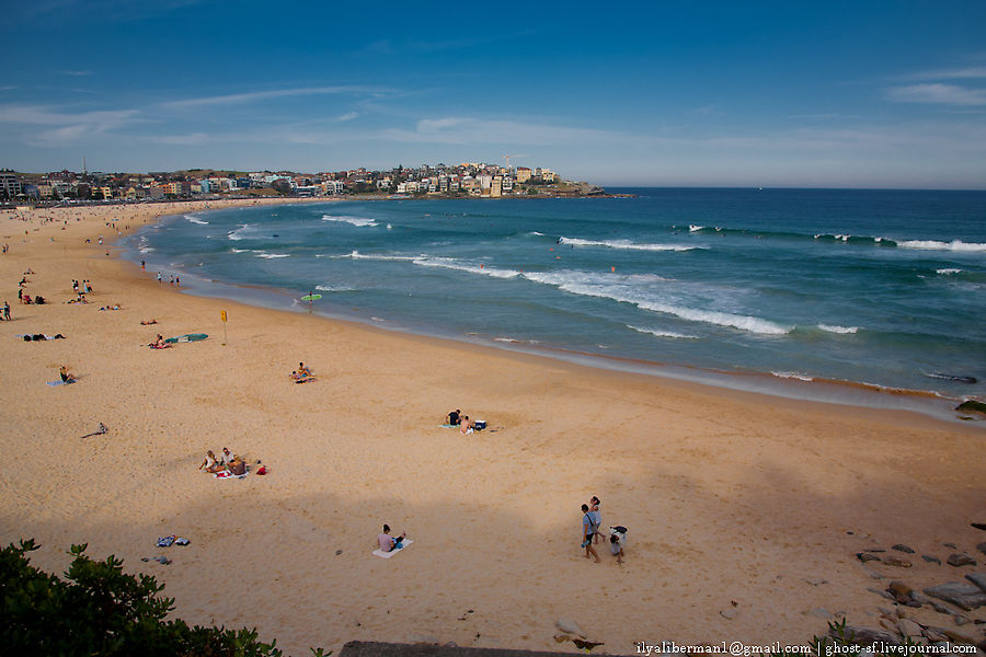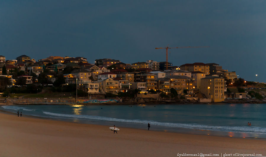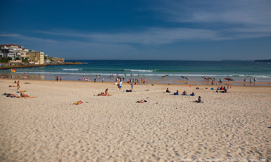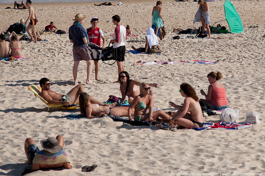 На Bondi сразу хочется втянуть живот, расправить плечи, и выглядеть на 15-20 лет моложе -:) . Пляж не пустеет и после захода солнца, допоздна работают многочисленные бары и рестораны. Легкий бриз с океана настраивает на романтический лад.