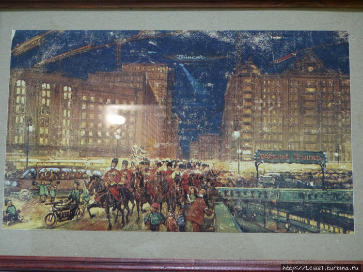 «Ясный вечер. Лубянская площадь. Синеву неба чертят четкие линии светящихся аэропланов, дирижаблей и вагонов воздушной дороги. Из-под мостовой площади вылетают длинные вагоны Московского Метрополитена, о котором при нас в 1914 году только говорили. По мосту над Метрополитеном мы видим стройный отряд доблестного русского войска, сохранивший свою яркую форму еще с наших времен. В синем воздухе мы замечаем товарный дирижабль Эйнем, летящий в Тулу с запасом шоколада для розничных магазинов».
