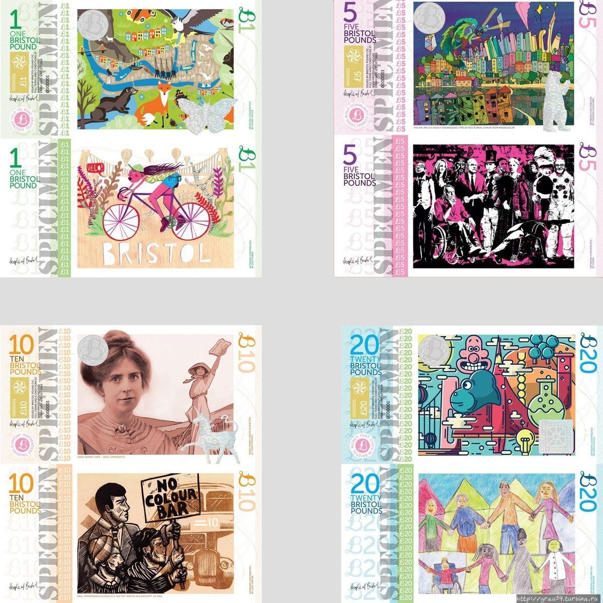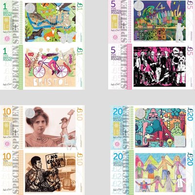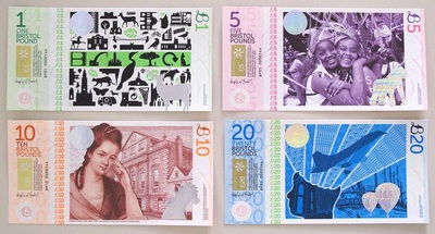 Существуют 4 номинала (1, 5, 10 и 20 бристольских фунта). Купюры и дизайн обновляются каждые три года.