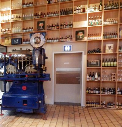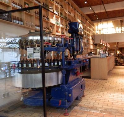 Котлы и старинные машины для розлива пива по бутылкам расположены рядом с торговым залом.