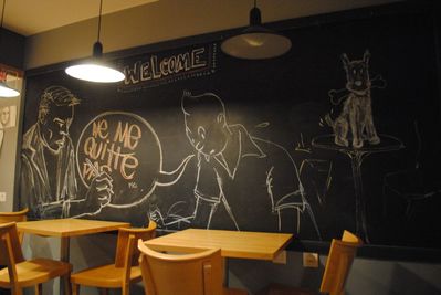В баре нарисованы персонажи комикса Эрже — Тинтин и собачка Милу (Мелок/Снежок в русских переводах). Знаменитая строчка из песни Жака Бреля "Ne me quitte pas..."