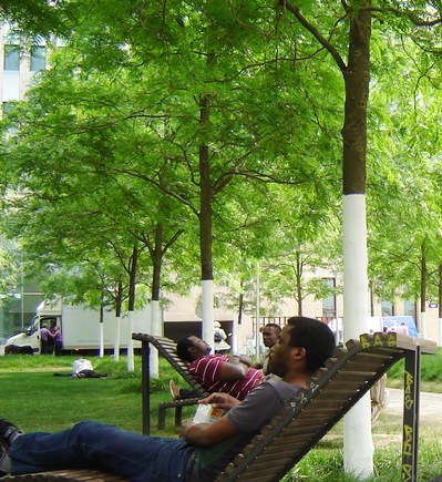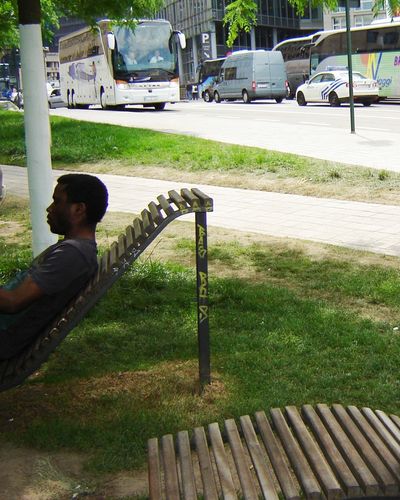 Перед кафедральным собором Святого Михаила и Святой Гудулы, рядом с центральным вокзалом в Брюсселе разбит парк, где на удобных лежаках может устроиться на ночлег небольшая группа людей.