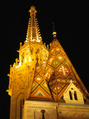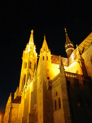 Собор Матяша подсвеченный ночью со всех сторон смотрится как огромный высокий костер из которого вот-вот начнут вылетать искры
