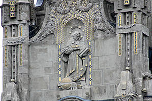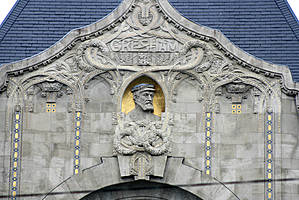 Портрет Сэра Томаса Грешэма — основателя лондонской Королевской биржи на дворце Грешем. Архитекторы Жигмонд Квиттнер и братьями Йожефом и Ласло Ваго. 1905 — 1907 гг.