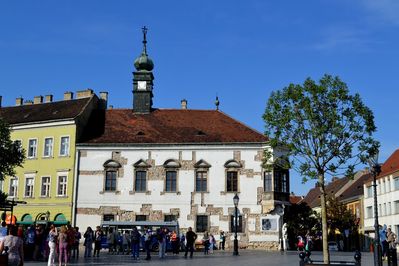 В конце площади стоит интересная скульптура бравому гусару в форме эпохи Марии-Терезии. Как известно и само слово гусар венгерского происхождения от huszár (húsz — двадцать).