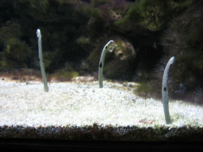 Мурены трёх видов – каждая забилась в скальную расщелину и пялится оттуда, как сплетничающая бабка из окна, а пятнистые садовые угри предпочли зарыться в донные отложения и торчат оттуда, наподобие чьих-то хвостов.