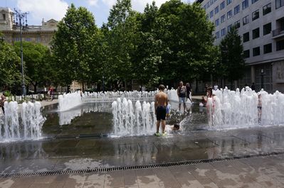 на площади интерактивный фонтан, где резвится и плещется в + 36°С детвора, чему нам на экскурсии оставалось только позавидовать.