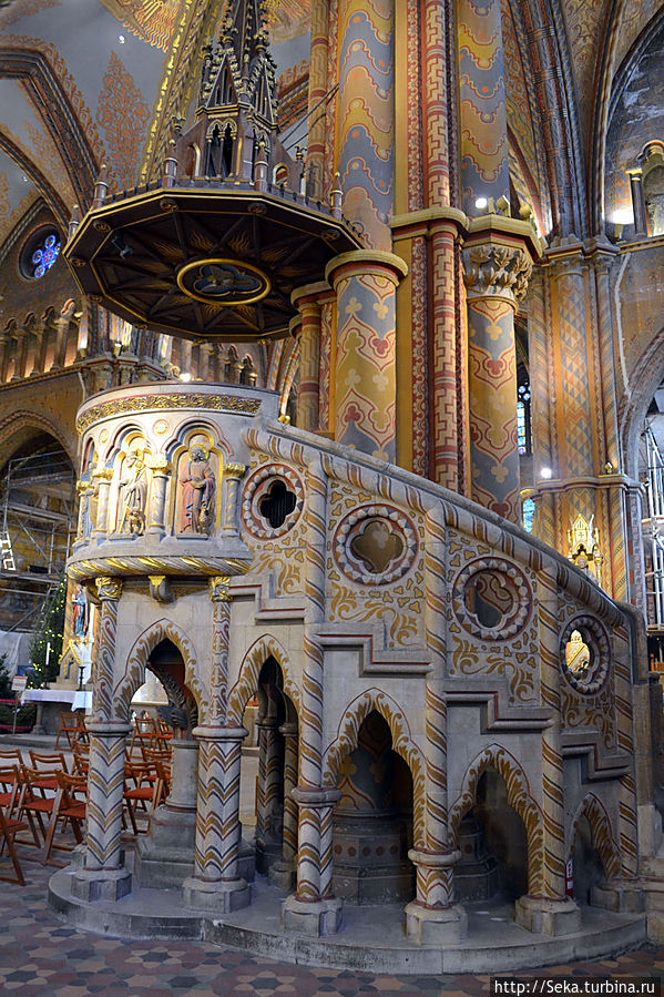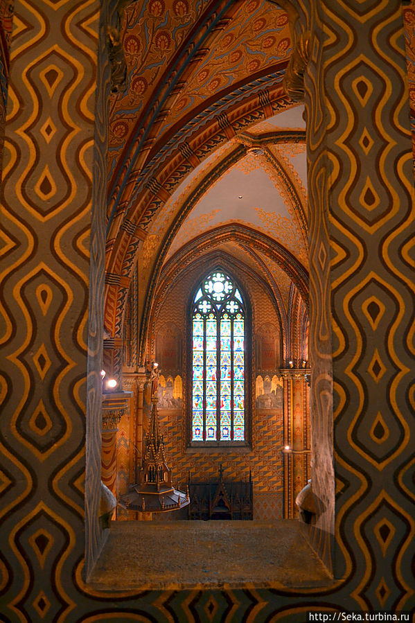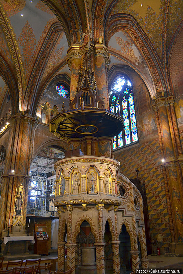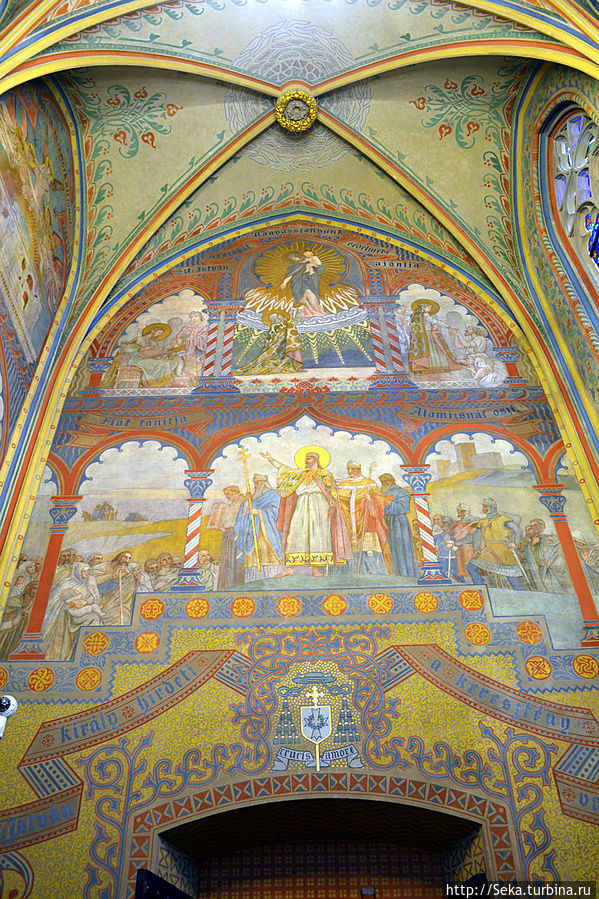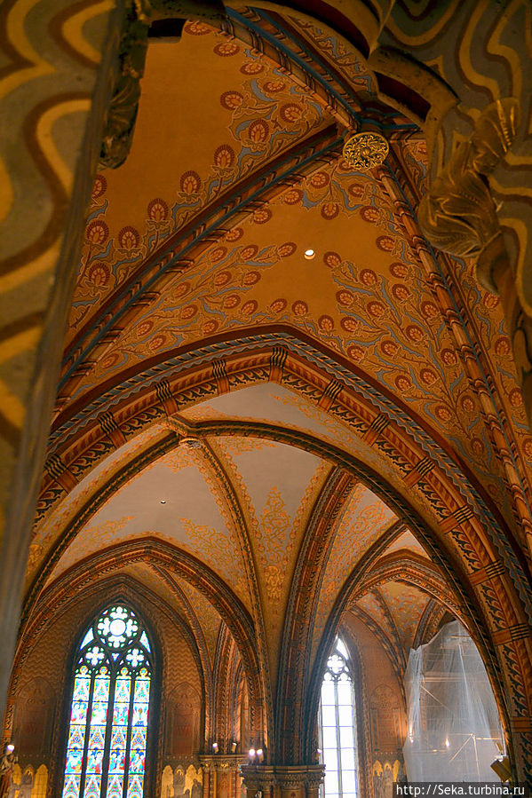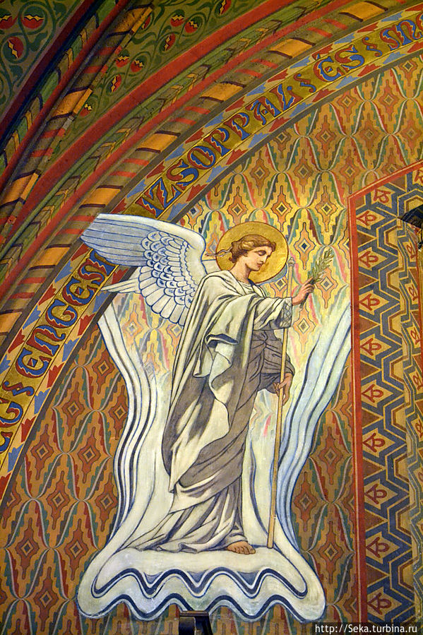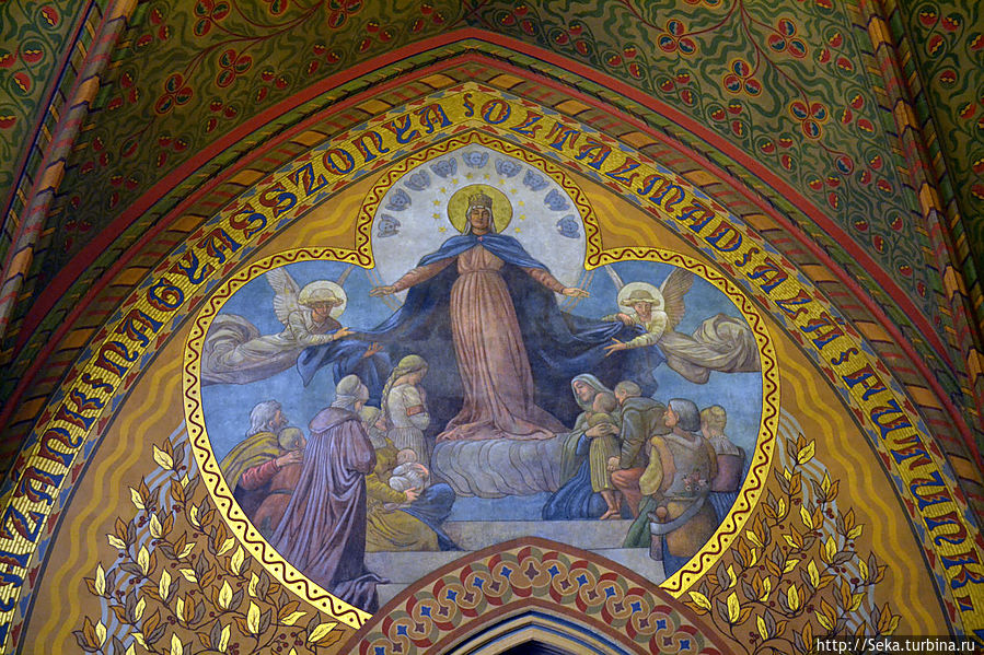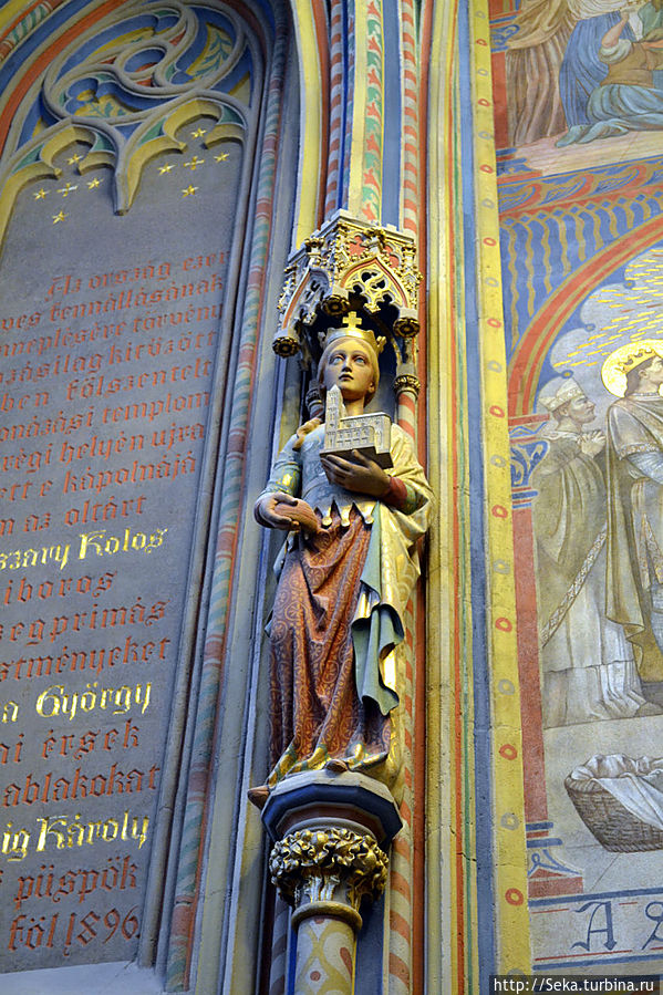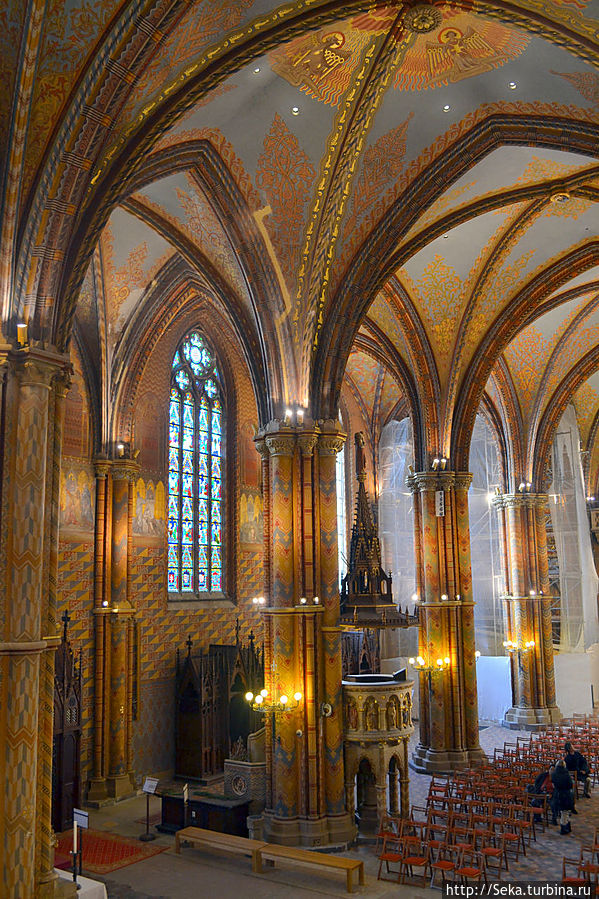 Вход оказался платным – 1000 форинтов. Касса нашлась напротив здания церкви. Кассир на вполне понятном русском языке пояснил, что билет дает право также на посещение музея внутри. Даже несмотря на то, что реставрационные работы, как оказалось, перекочевали внутрь церкви, она оказалась просто великолепна. Неожиданно яркой. Все её стены покрыты росписями, выполненные венгерскими художниками.