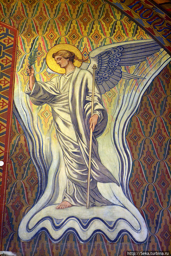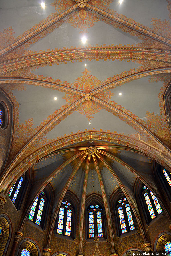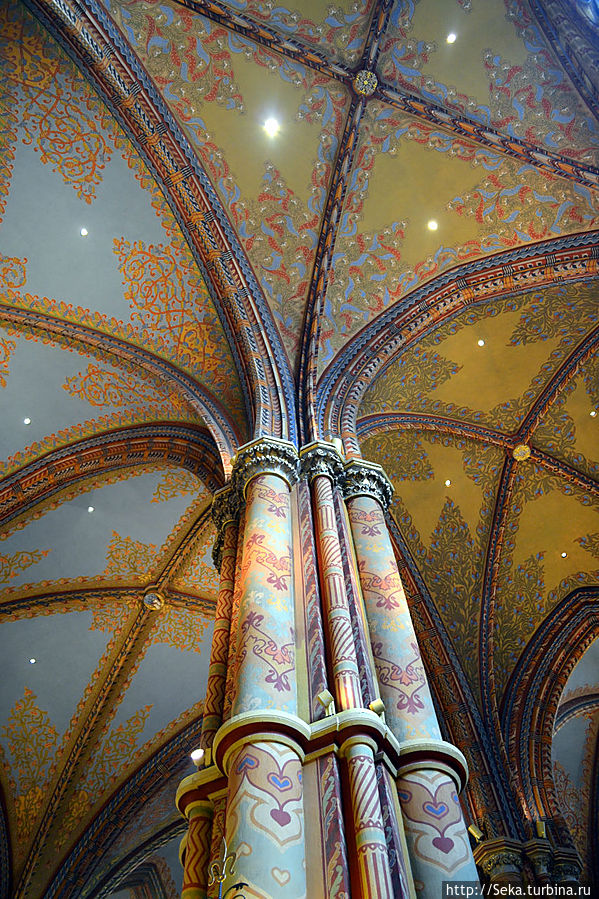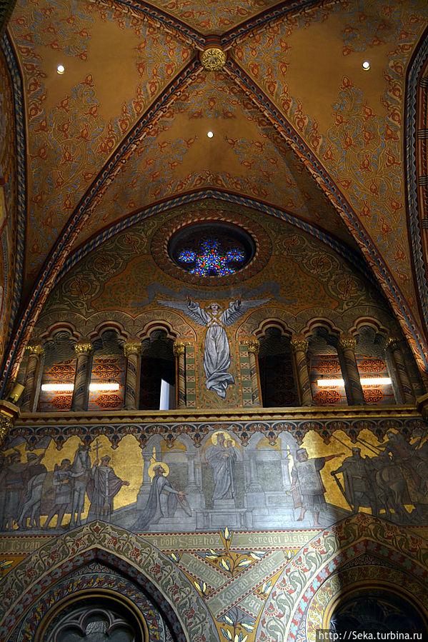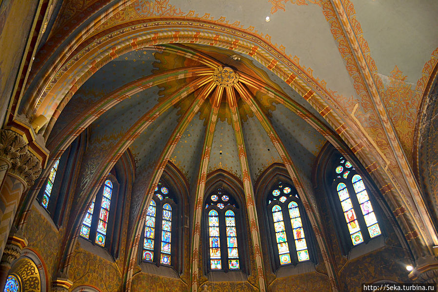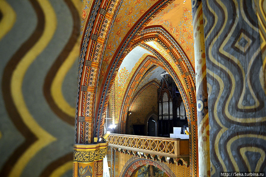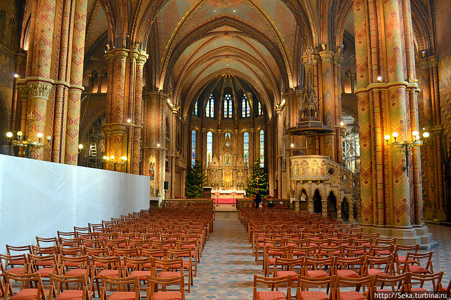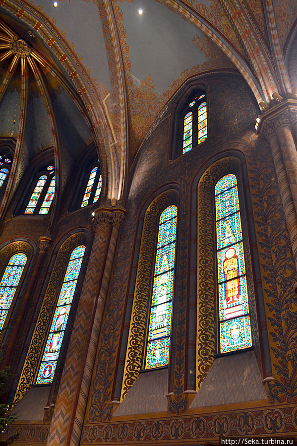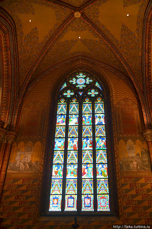 Вход оказался платным – 1000 форинтов. Касса нашлась напротив здания церкви. Кассир на вполне понятном русском языке пояснил, что билет дает право также на посещение музея внутри. Даже несмотря на то, что реставрационные работы, как оказалось, перекочевали внутрь церкви, она оказалась просто великолепна. Неожиданно яркой. Все её стены покрыты росписями, выполненные венгерскими художниками.