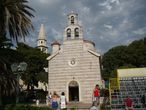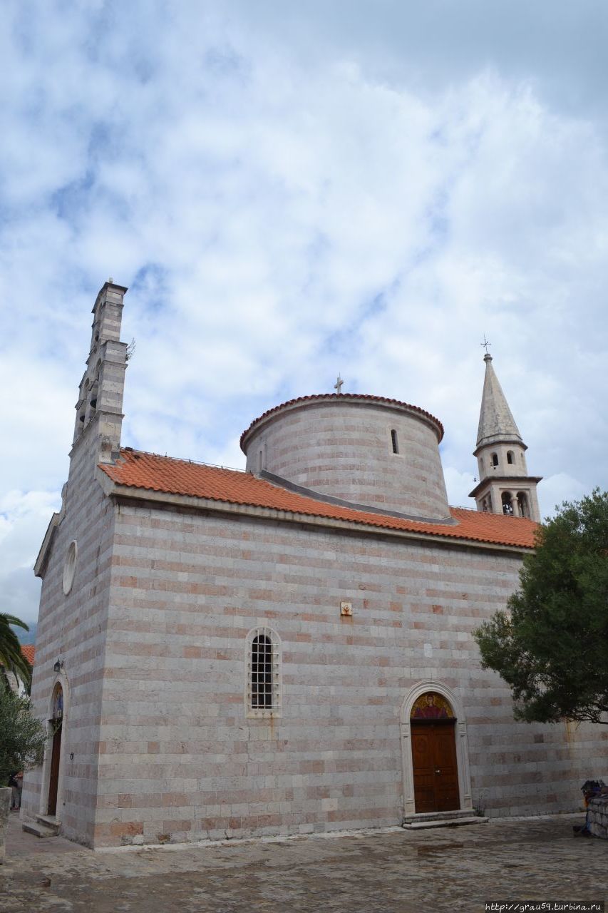 На высокой колокольне прямо над входом в храм расположены три колокола, звон которых во время служений разносится по всей Будве. Венчает же всё здание большой купол, покрытый ярко-красной черепицей, который только добавляет некую нарядность и торжественность всему образу.