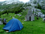 После привала с обедом проходим сногосшибательную по красоте поляну. Долго поднимаемся вверх и уже в сумерках по сильно каменистому склону спускаемся в долину, держа ориентир на белеющую в темноте церковь.Это был тяжелый и длительный переход. Мы устали, у нас практически не было еды и самое — главное воды. Уже в глубоких сумерках девушки отправились за водой к домику, который мы заприметили сверху.