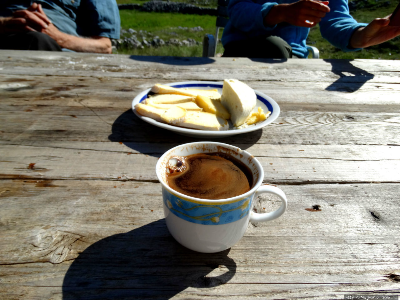 Они еще вечером отдали нам весь свой хлеб и сильно соленый сыр, поэтому угощали только козьим сыром и кофе,Здесь мы запаслись водой и ушли дальше в горы. Море не оставляет нас, да и нам не хочется расставаться с ним.