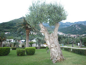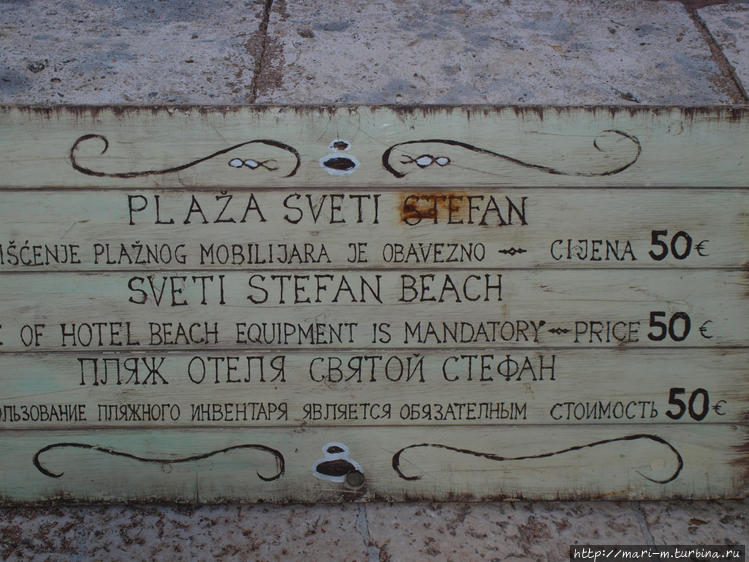 Конечно, первая вечерняя прогулка к острову San Stefano. Мы не знали, что это около 7 км пути, но тем привлекательнее было шагать вдоль побережья, всякий раз ожидая, что за очередным поворотом, откроется вид на символ Черногорского побережья — остров Святого Стефана! Передохнула перед входом в тоннель под горой. Вот и показались знаменитые пляжи. Цены за сутки пользования говорят сами за себя. . Территория перед пляжем высажена оливковыми деревьями и судя по их чудаковатым формам — лет им много..