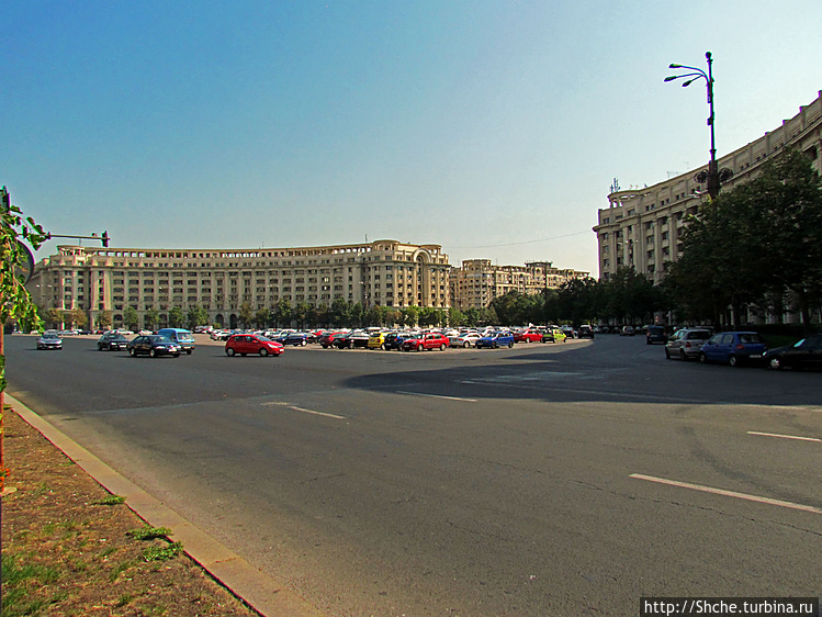 К подножию дворца ведет соответствующиий размаху сооружения бульвар Унири с фонтанами и громадными зданиями вдоль (заметьте, часы в сторону от парламента подписаны уже просто "Бухарест", это одни и те же часы, что и на первой фото