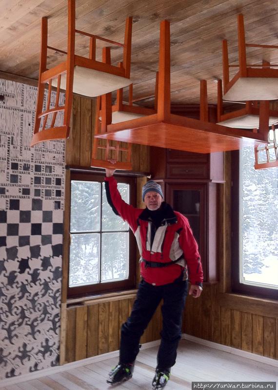 И вот там-то и разыгралась фантазия авторов задумки – вся мебель тоже перевернута и прикручена к потолку. И даже чучело лисы!
