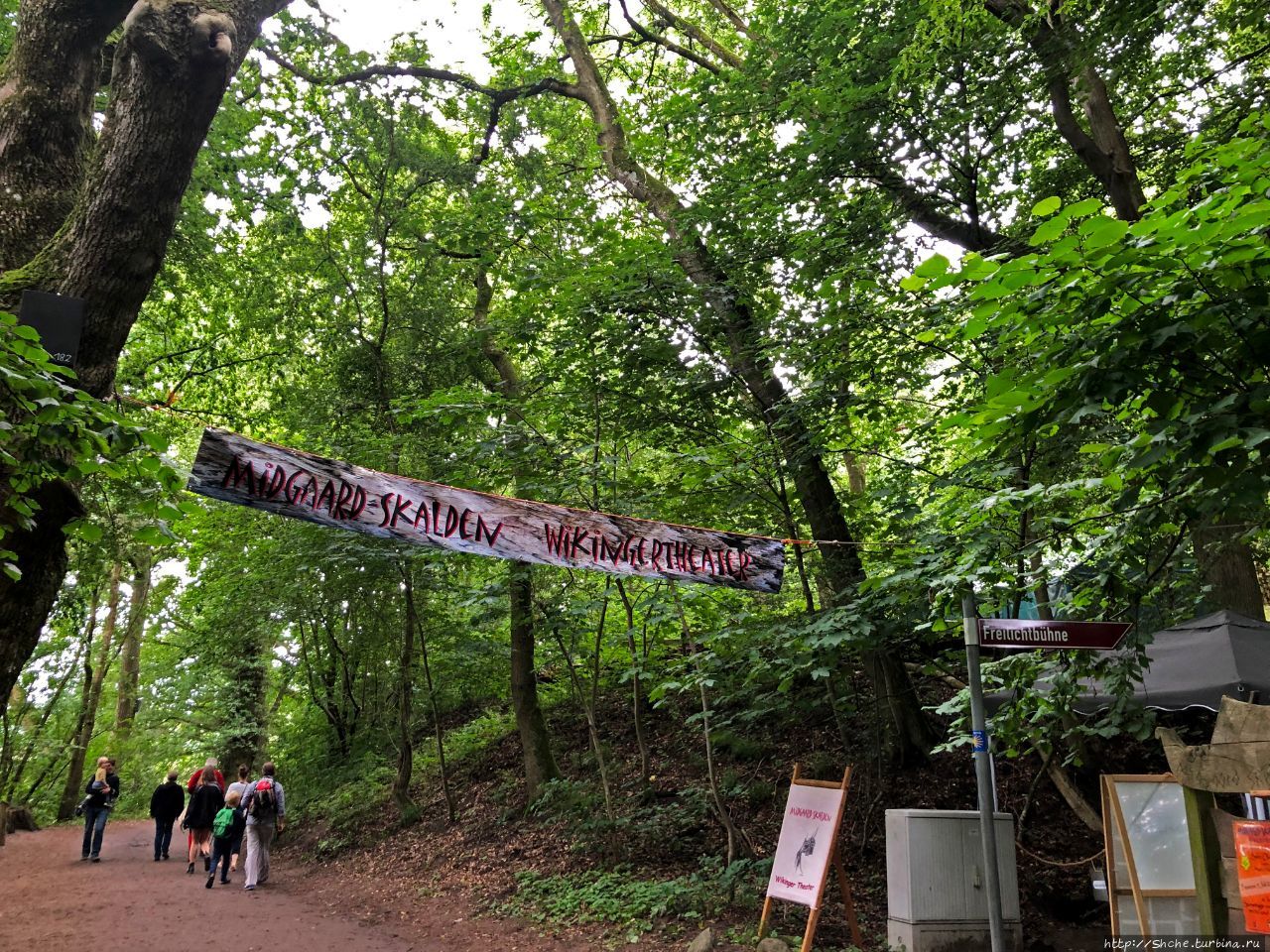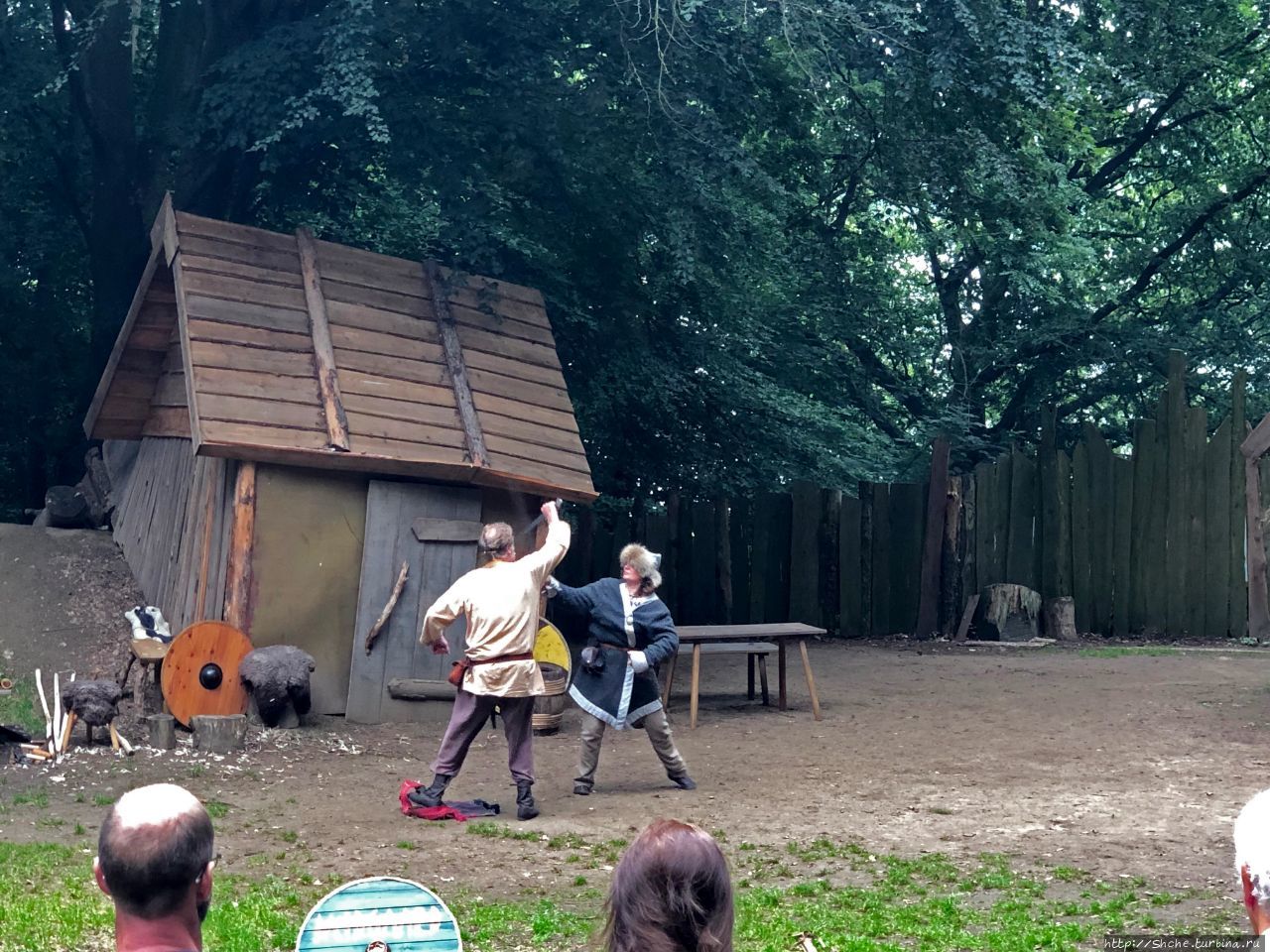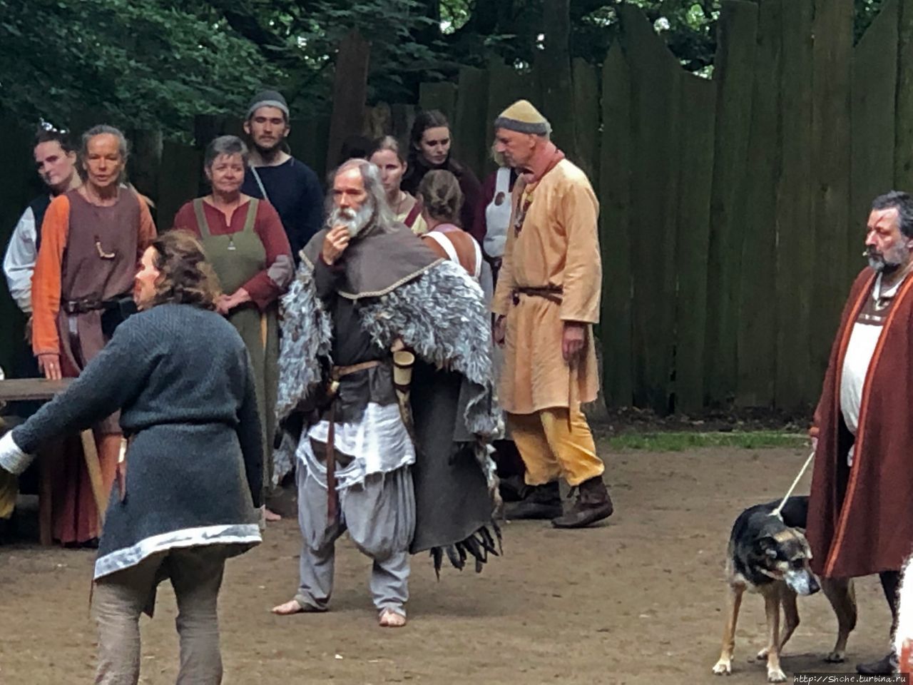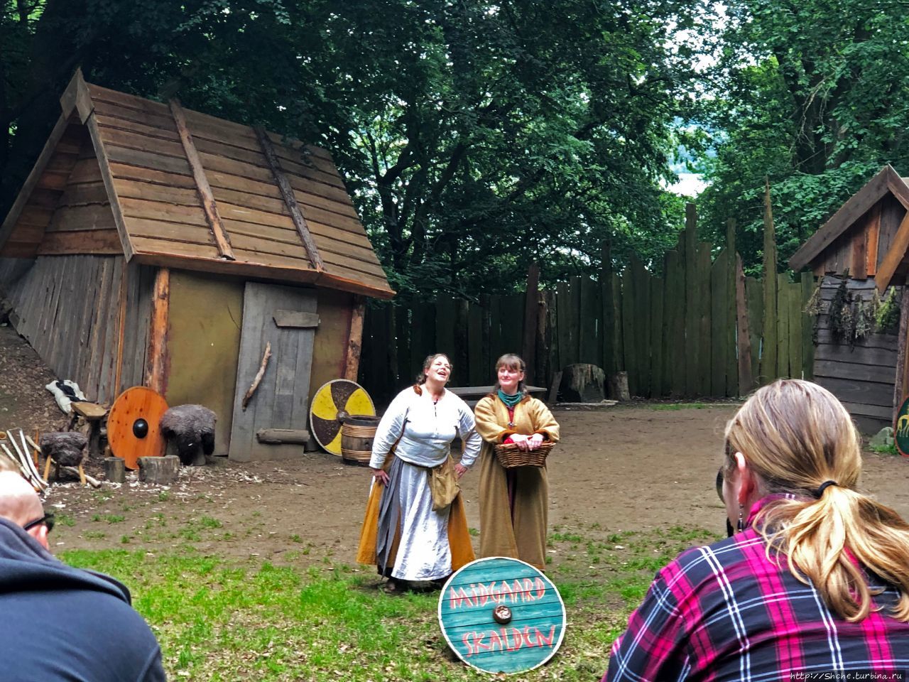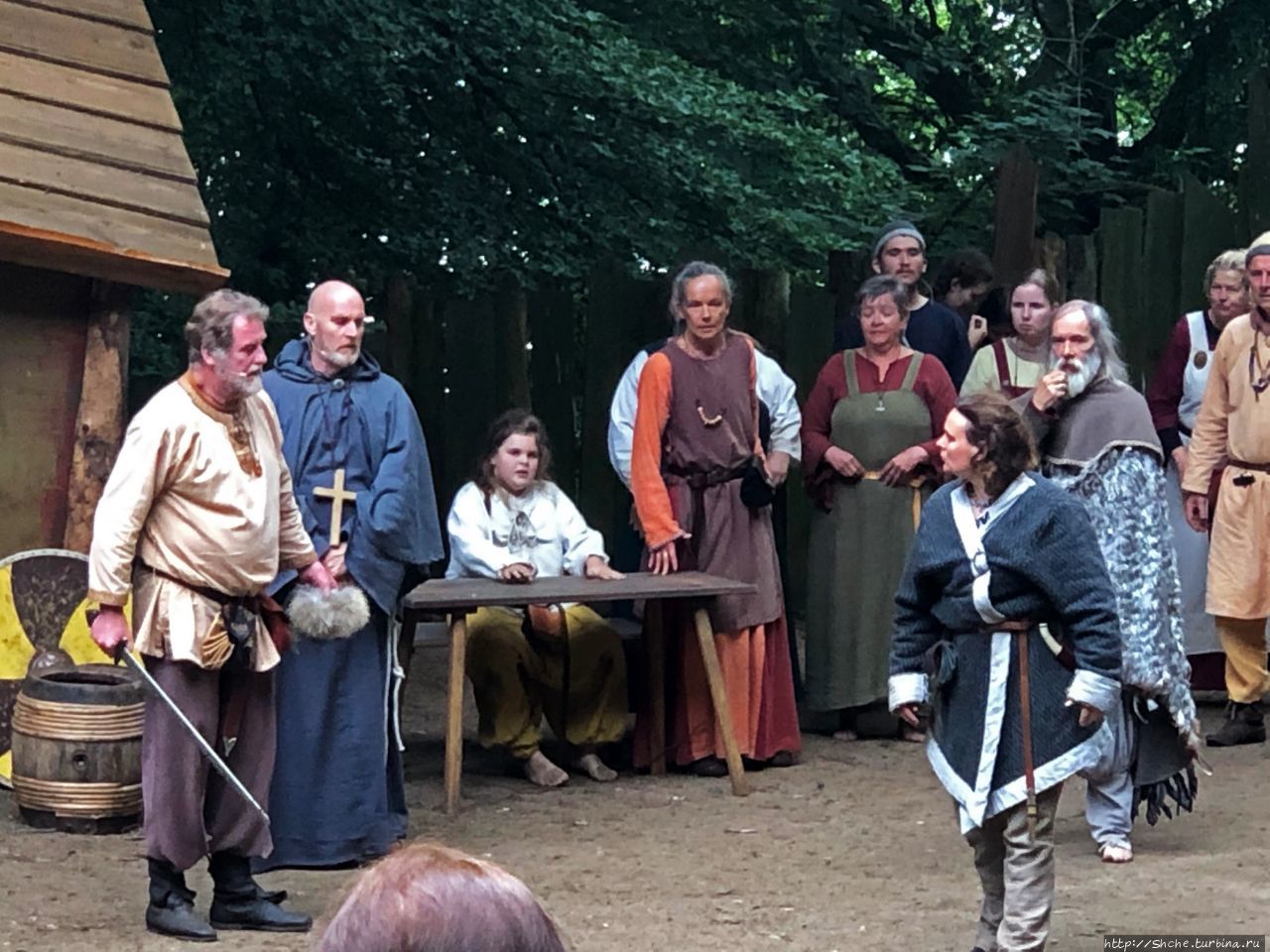 Здесь я, так сказать, вскочил на подножку уходящего поезда. оказалось, что "Театр Викингов" это не архитектурное сооружение типа римского амфитеатра, а настоящий театр под открытым небом, где труппа дает спектакли на тему жития деревни викингов. Последний спектакль как раз начинался, и билетерша собирала свои вещи (кассу в основном) и собиралась уходить. Мне она с удивлением продала билет за 5 евро, не понимая моего желания туда попасть...