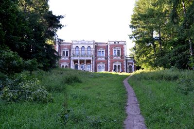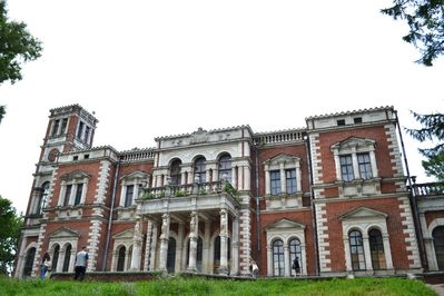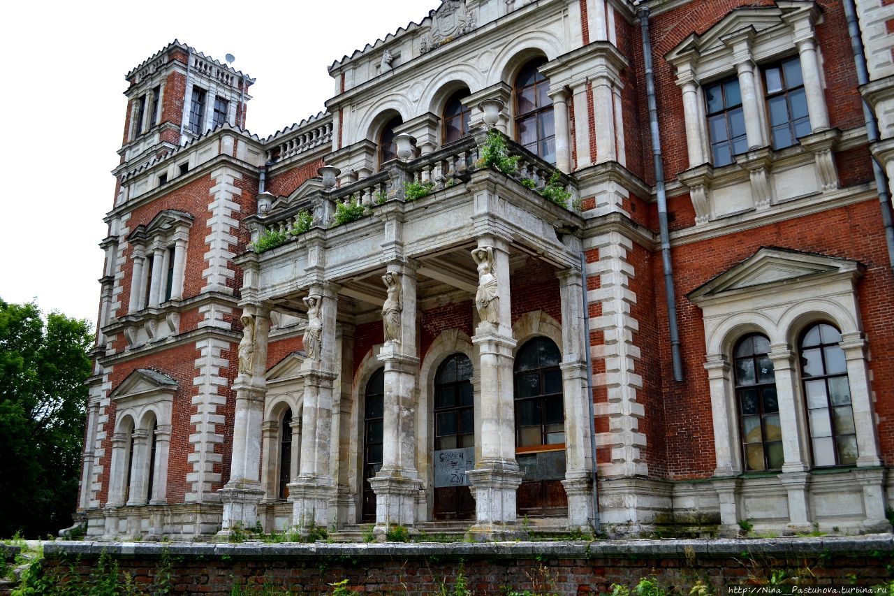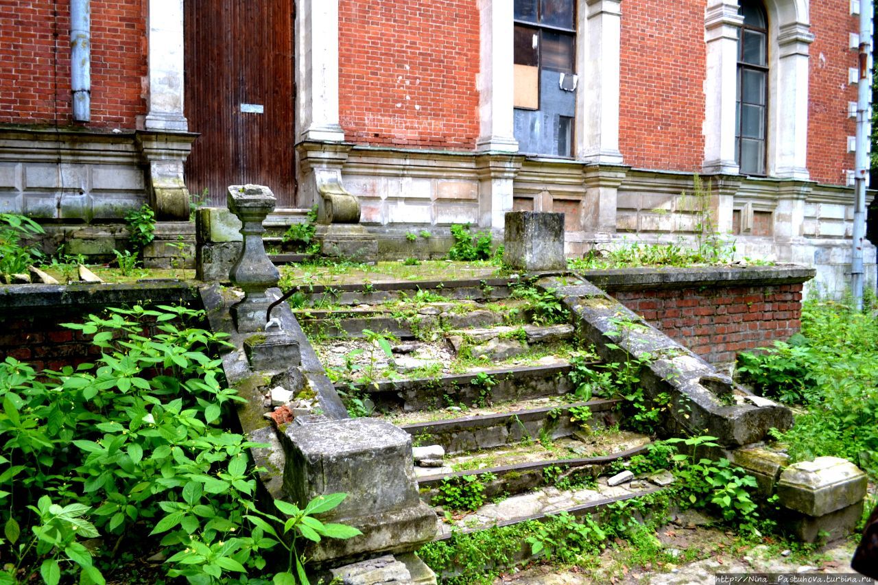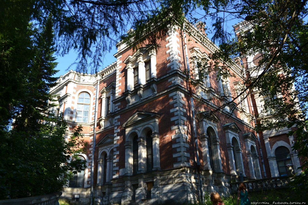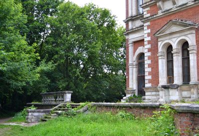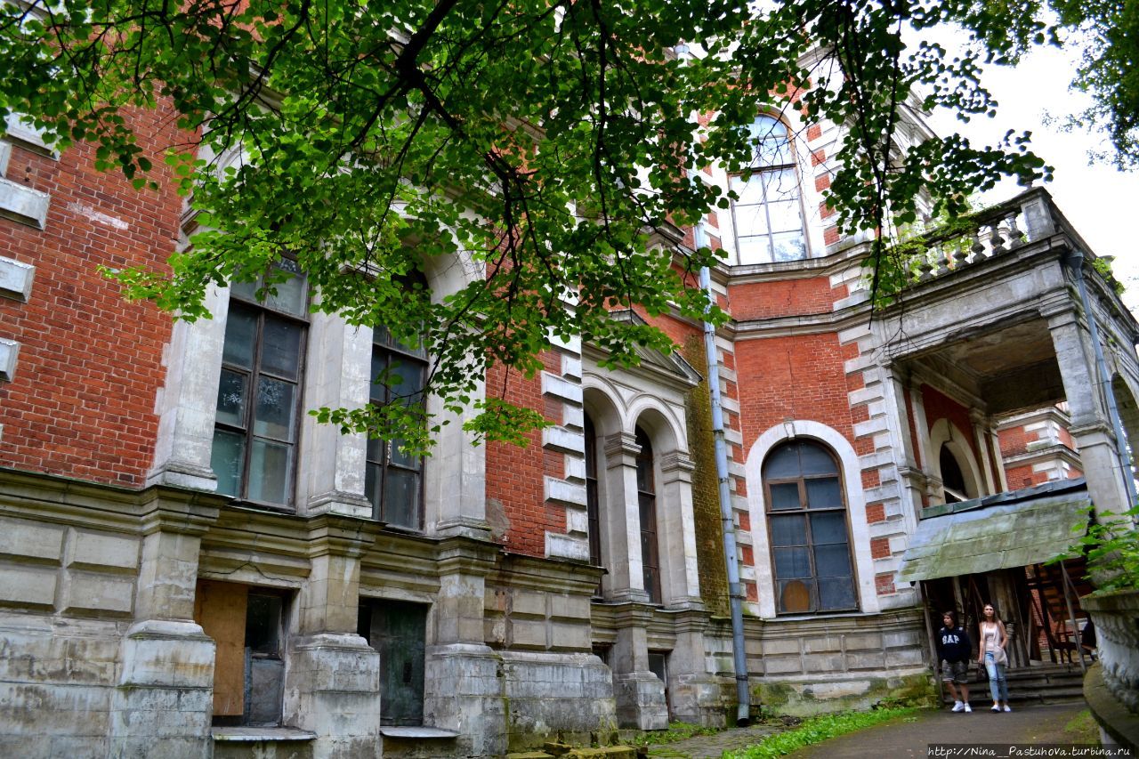 Итак дворец. Мы подошли к нему с северной стороны, от проходной. Здесь нужно сказать, что в последнее время здесь находился противотуберкулёзный санаторий, вот проходная и осталась с тех пор. Небольшая аллея привела нас к зданию, построенному из красного кирпича.