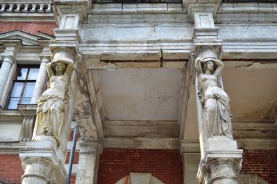 Фасад выполнен в классическом стиле и его украшает великолепный портик с кариатидами. Крыша портика служит балконом, выход на который осуществляется из кабинета графа, расположенного на втором этаже прямо по центру здания.