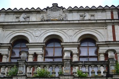 В центре фасада находится парадная лестница, украшенная греческими вазами и балюстрадой.