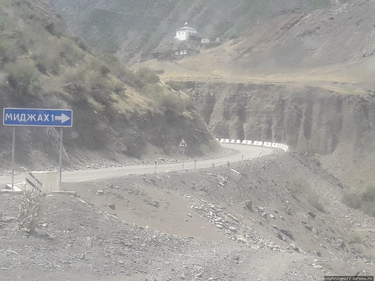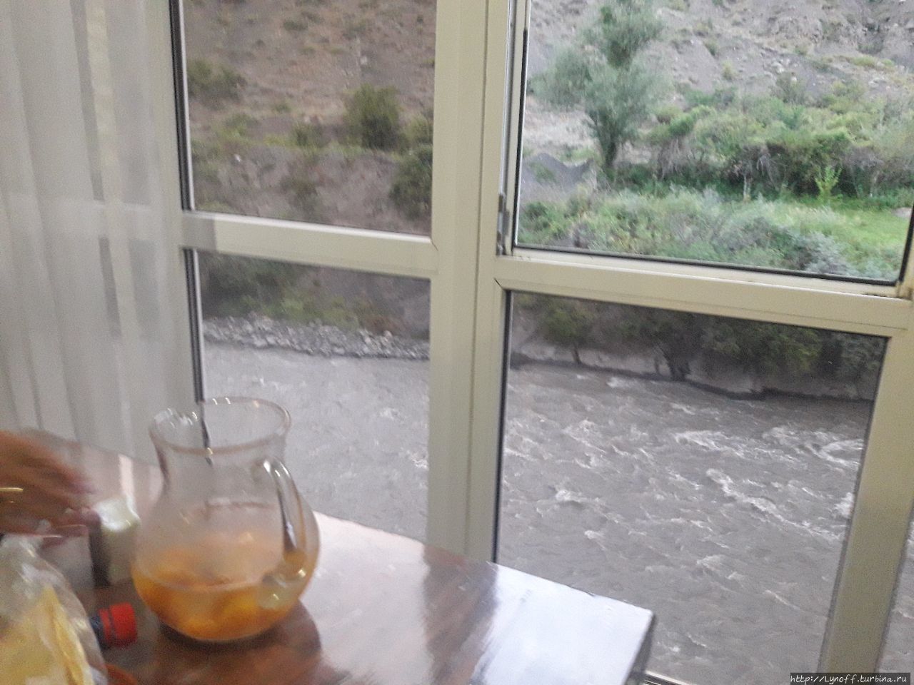 . Однако нам сказали что Велимагомед находися в другом месте на каких то верхних источниках. Кое как их нашли опяь таки с помощью местных. Нас там действительно ждали, номер люкс по цене 2000 руб. Однако номер люкс имеет специфическую конфигурацию — общий корридорчик и из него две двери — в купальню и в спальню. Тк купальня и спальня как бы совмещены в номере стоит неимоверная влажность и духота. Окна на улицу напрямую из спальни нет, кондиционера тоже нет. В общем это нас не привлекло и мы вернулсь в гостиницу на фото выше. Оказалось там полно мест, мы были чуть ли не единственные постояльцы. Двухкомнатный номер — в одной комнате двуспальная кровать в другой диван телевизор и холодильник стоил 2000 в сутки. Состояние номера вполне приличное, санузел слегка раздолбан, но не критично. Гостиница расположена на берегу довольно бурной реки и представляет собой комплекс из купальни в серной и радоновой воде на первом этаже, кафе на втором этаже и собственно номеров на третьем. Нам достался номер выходящий окнами на реку. Спать под шум горной реки довольно приятно. Вид из окна кафе на речкуПереночевав, на следующий день мы решили сьездить в Миджах.
