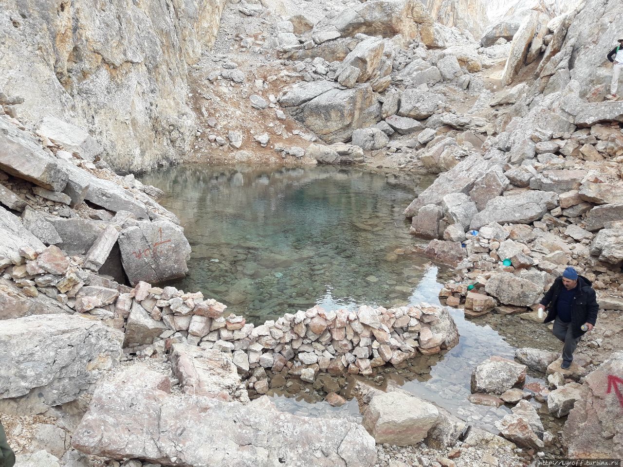 Приехали. От площадки где паркуются машины до собственно лагеря еще нужно подниматься пешком. Этого подъема хватило чтобы деморализовать мое семейство. Сказали дальше не пойдут, будут ждать меня в лагере. От лагеря до конечной точки подъема на высоте 3800 еще километр высоты, по расстоянию же это примерно 4км. В лагере есть большая столовая с кухней и помещение для ночлега. Еда чай ночлег все бесплатно. Жена с дочкой обосновались в столовой а я отправился наверх. Кто то в это время уже спускался вниз и не налегке а с канистрами воды из озера Зам Зам или Зем Зем. Люди на Шалбуздаг идут самого разного возраста разной комплекции и состояния здоровья. Тетушка в гостинице в Курукале сказала что ходила на Шалбуздаг раз 10. В общем, по моим ощущениям, это почти любому по силам, вопрос только сколько это займет времени. Спускаться значительно сложнее, ноги скользят, коленки уже болят. На высоте примерно 3600 находится озеро Зам Зам. Довольно уникальный объект на такой высоте где никакой растительности уже нет.