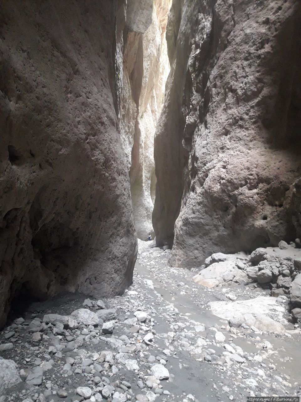 Опять таки никаких указателей. Хорошо maps.me показывает точку под названием вход в карадахскую теснину. Приезжаете в эту точку — опять таки не совсем понятно куда дальше идти. Хорошо прямо перед нами приехала группа молдых людей и мы у них спросили. Иди нужно по руслу речки на дне довольно широкого ущелья. Собственно место входа находится у моста через эту речушку. Идем идем и идем, все как обычно указателей нет, сколько еще идти — непонятно, Рельеф довольно сложный, русло петляет, высота берегов постоянно меняется, много кустарников, видно что рельеф сильно зависит от погоды и речушка может быстро и сильно подниматься. И вот наконец пришли, началась собственно теснина.