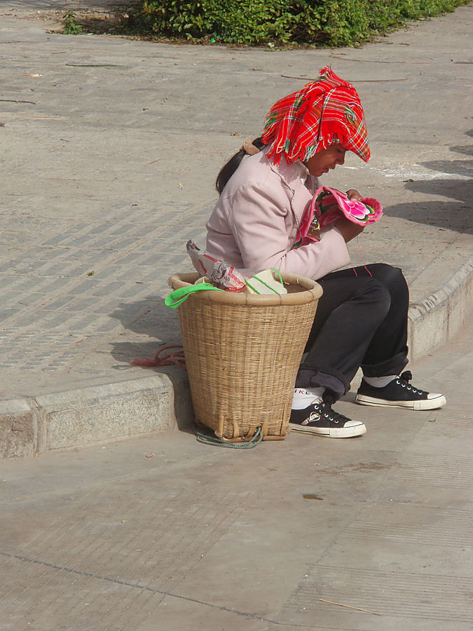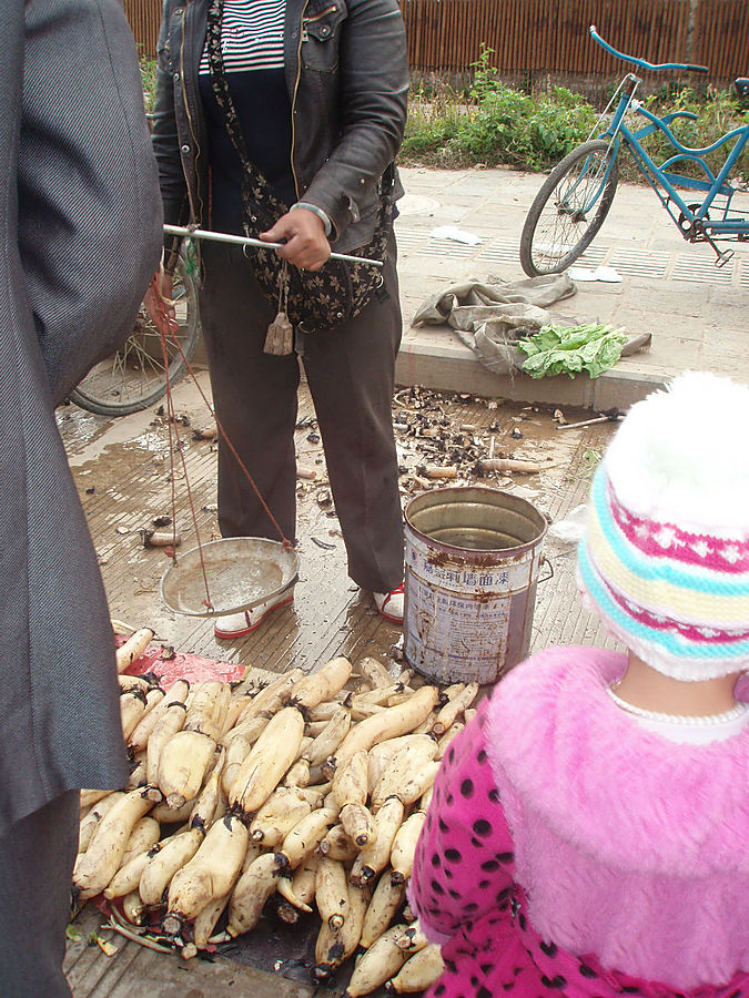 Собачка смотрит, как мы ловим такси до автовокзала. Наш путь в Лицзян!