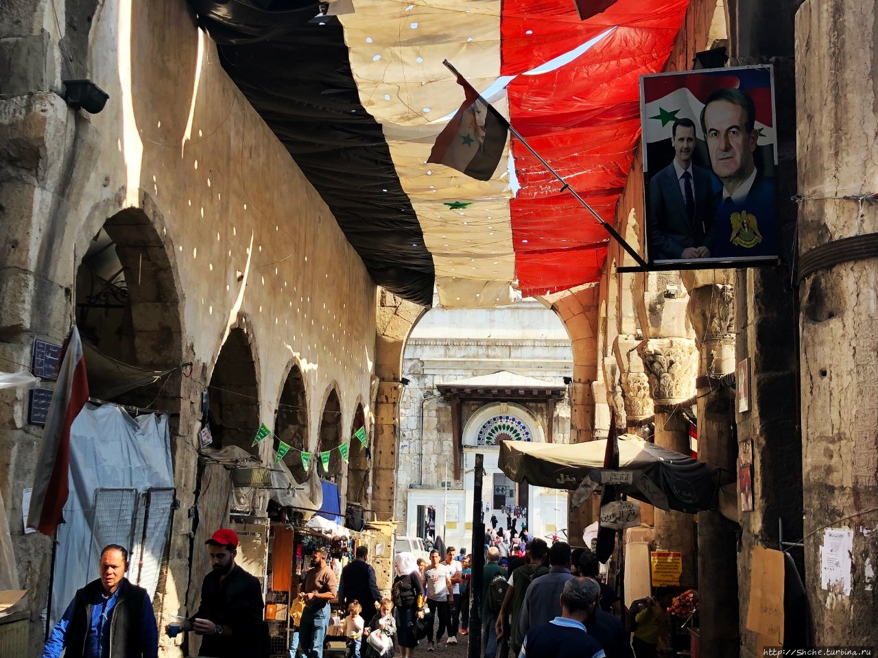 Сейчас над аркадой не сохранилось перекрытие, потому наверху растянут огромный флаг Сирии.