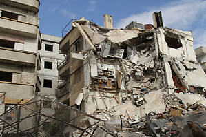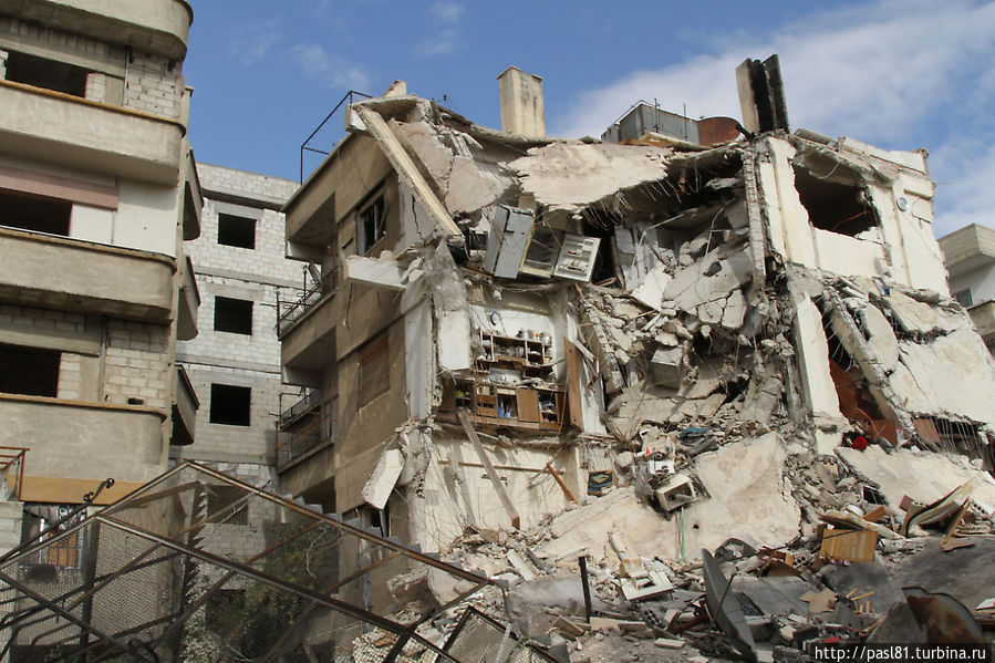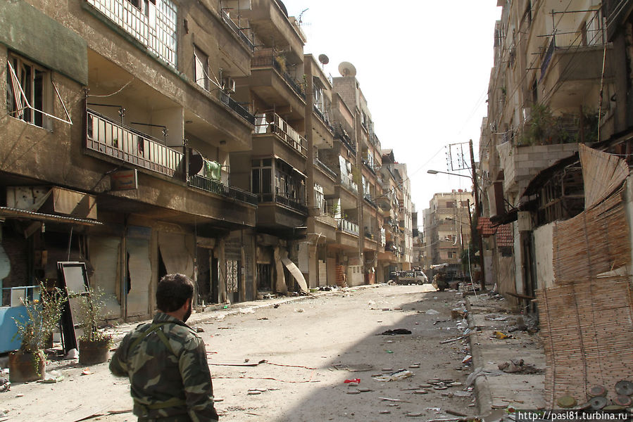 Заходим в проулочек, где скрылся мальчуган и попадаем в гости к старику. Он собирается остаться здесь, и вернулся не за тем, чтобы только забрать свои вещи. Дома малые дети, но они не выглядят сильно испуганными. Старик благодарит солдат, позволивших ему вернуться домой, показывает свою небольшую квартирку с красивыми цитатами из Корана на стенах. Выходим. Воодушевленные солдаты начинают скандировать "кричалку" в поддержку Башара Асада. Старик старается больше всех. В верх взлетают автоматы. Голоса все громче. Вдруг, старик, которому кто-то тоже дал автомат, выпускает вверх две пули. Автомат тут же отбирают, но вот уже кто-то из солдат последовал его примеру. И через мгновение тишина нарушена десятками автоматных очередей. В меня летят гильзы, куски штукатурки с соседних стен. Гул "кричалки" соревнуется с мощью выстрелов…