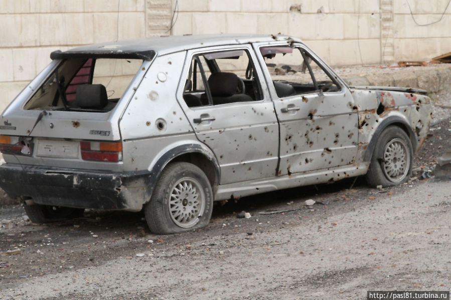 В паре километров заглянули в разрушенный квартал. Целые дома лежат, сложившиеся от обстрелов. Здесь были тяжелые столкновения. Особенно поразил кухонный гарнитур, висящей на стене где-то над грудой обломков и холодильник, в открытой дверце которого еще стоят бутылки с маслом… Настенные часы, с еще живыми стрелками, но уже в мертвом доме. Прострелянные спутниковые тарелки. Обгоревшие проемы окон. Огромные завалы, уходящие вдаль… Настоящий "Сталинград".