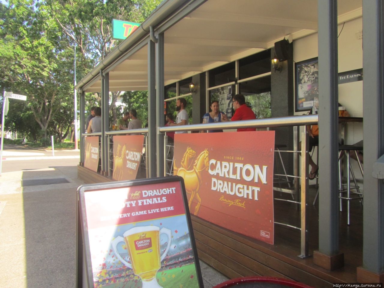 Дарвин печально известен как самый пьющий город в Австралии, и как назидание и предупреждение на каждом шагу выставлены предупредительные плакаты о зоне, свободной от алкоголя и курения. Штрафы за нарушение очень серьезные – от 1000 до 5000 австралийских доллара. Наверное, поэтому все местные бары были битком забиты любителями пива, и первый был в отеле Дарвин на углу Митчелл стрит.