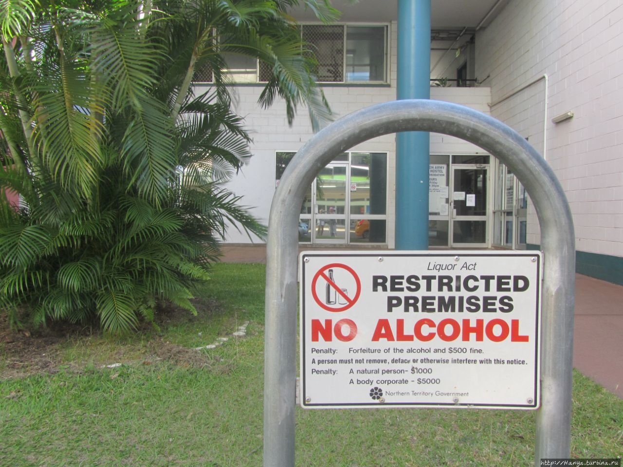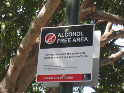 Плакат грозно указывает на то, что это «зона, свободная от алкоголя» и распитие алкогольных напитков на общественной территории карается как весьма серьезное правонарушение. Принятые меры состоят из изъятия напитков и наложении штрафа от 100 до 500 австралийских долларов.