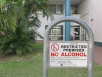 Плакат грозно указывает на то, что это «зона, свободная от алкоголя» и распитие алкогольных напитков на общественной территории карается как весьма серьезное правонарушение. Принятые меры состоят из изъятия напитков и наложении штрафа от 100 до 500 австралийских долларов.
