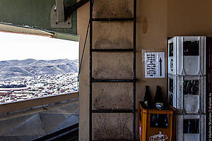 Спиральная лестница ведет на верх. Проход к лифту перегорожен шваброй, да и сам он не выглядит рабочим. Поднимаюсь на круговую площадку наверху. Проход завален какой-то поломанной мебелью, под ногами мусор, но открывающиеся виды великолепны! Весь город как на ладони. Видна и гора с шахтами, и обогатительная фабрика, и центр города, и отвалы переработанной породы. Однозначно стоит подняться!