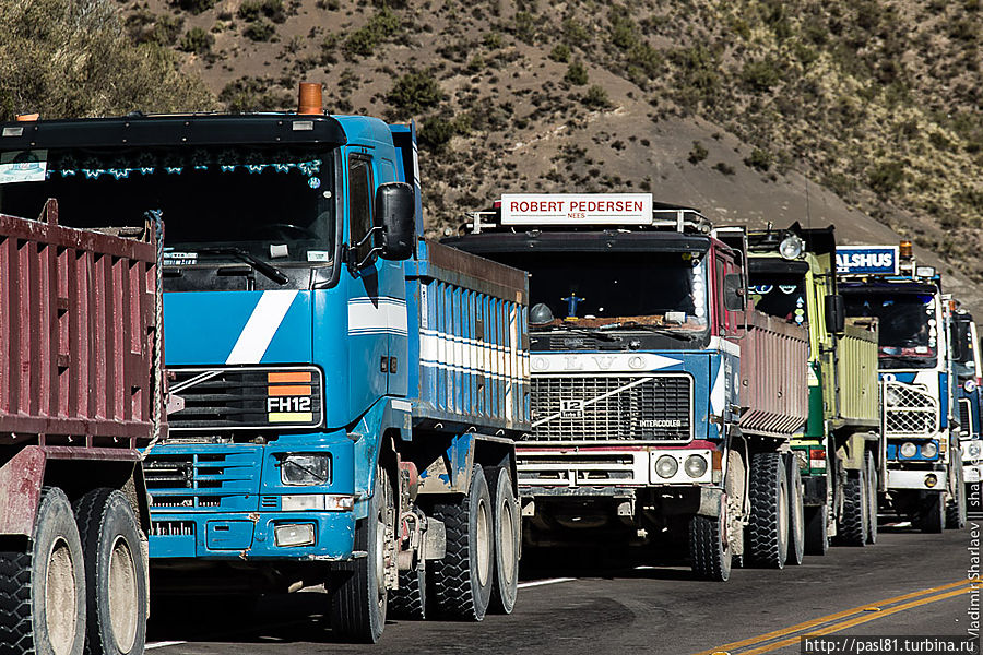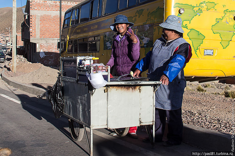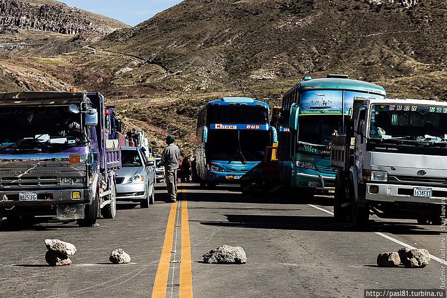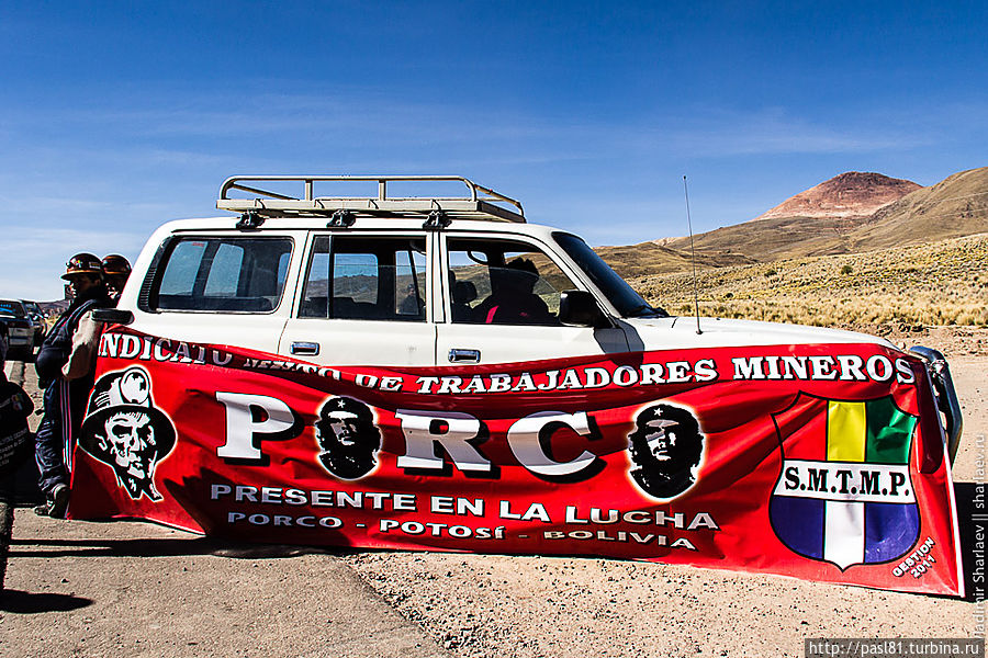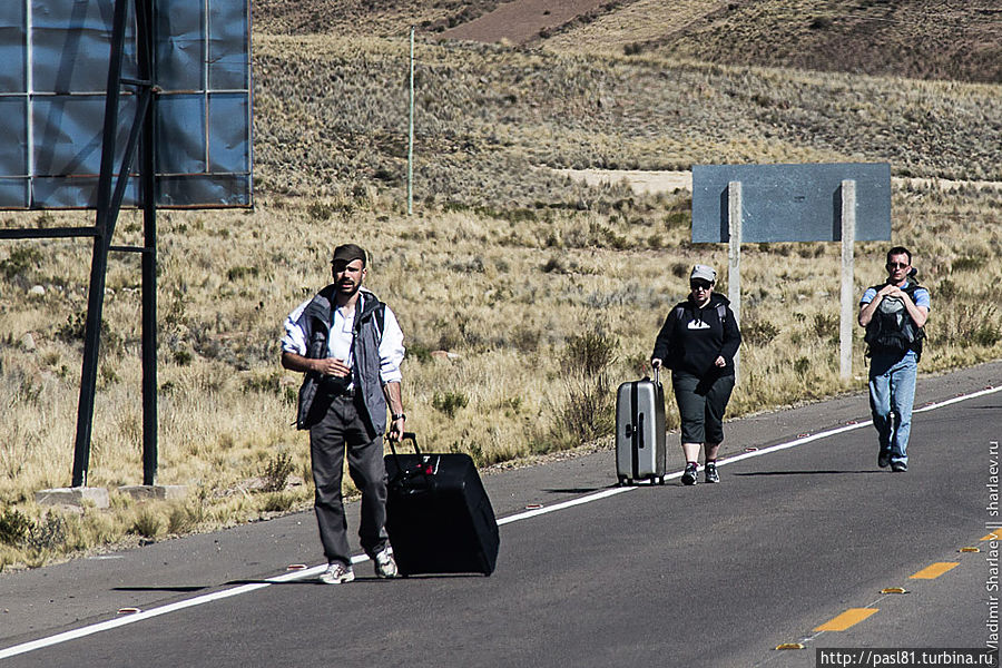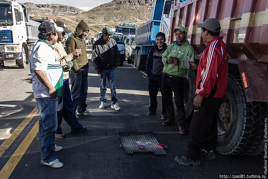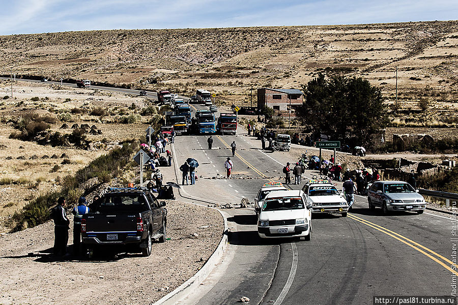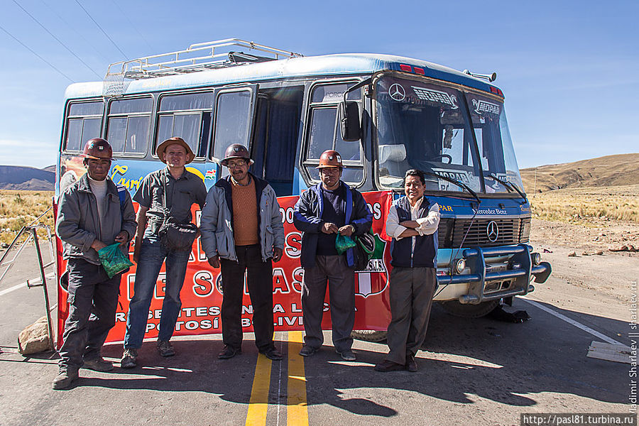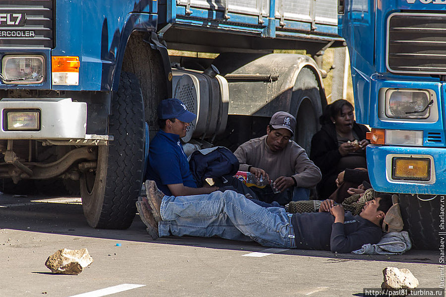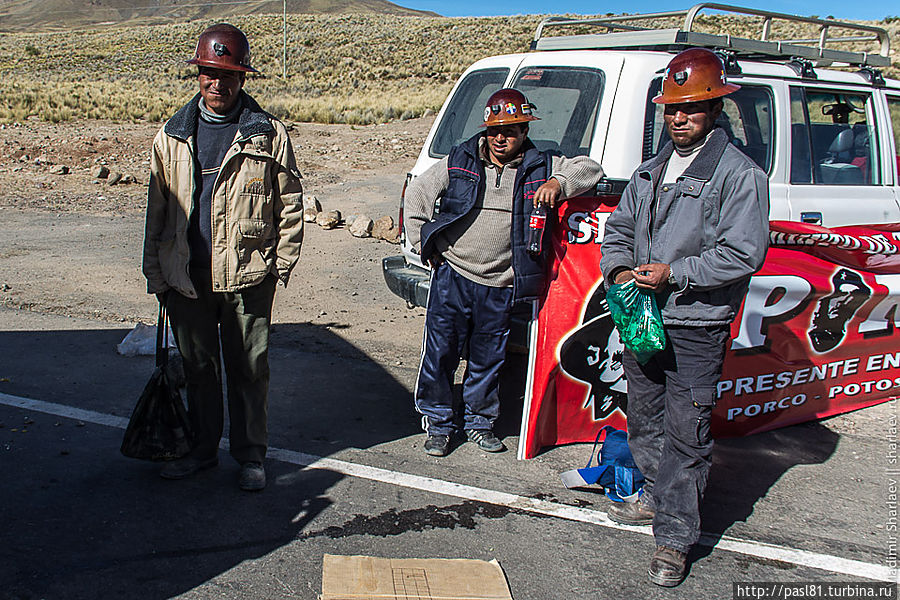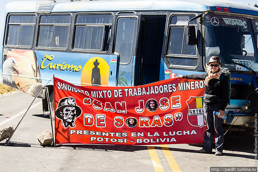 Дошли до самых последних строений. Дальше дорога уходит в горы. Подъехал не особо трезвый товарищ и что-то стал объяснять, но не нашел в нас понимания. Наконец, останавливается пикап с американско выглядящими мужиками. Английским владеют. Говорят, впереди дорога перекрыта бастующими рабочими. Как, впрочем, и все остальные ведущие из города трассы. И не только здесь, а по всей стране! Интересное дело получается. Застряли в Потоси? Когда трудящиеся завершат свою стачку — не понятно…