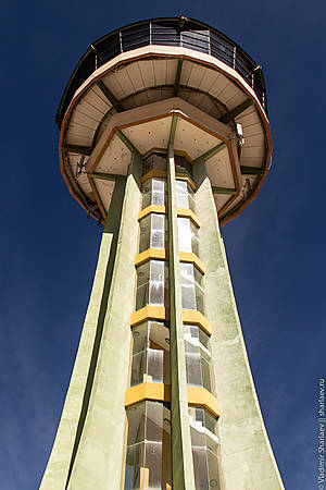 На карте отмечена смотровая площадка. На местности это выглядит как высокая башня. Дорога на выезд в сторону Уюни, куда мы направляемся, как раз мимо нее проходит. Надо только подняться по небольшому серпантину на холм и ты у подножия вышки. Наташа решила, что находиться еще успеет и не пошла на верх. А я поднялся и с удивлением обнаружил табличку, что оплату в размере 4-х боливиано можно произвести в ресторане! Не телевышка это, а вот такой вот необычный ресторан.