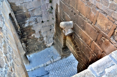 Они фланкированы с внешней стороны двумя прямоугольными выступами, усиленными наклонными подпорными стенами, которые образуют узкий проход, через эти ворота можно незаметно покинуть крепость.