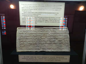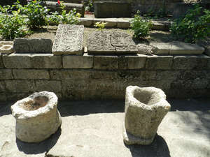 Недалеко от входа на обзор выставлены старинные надгробные плиты больших и малых размеров,