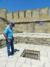 Относительно недавно учёные обнаружили в крепости Нарын-Кала целую церковь. Сверху через её бывший купол заглядываем внутрь, где видим воду.