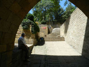 Итак, мы у северной стены крепости Нарын-Кала, и после 3-х часов езды наконец-то выходим из машины. Наш гид Жабир Омаров в туризме более 30 лет. Жабир обращает наше внимание на круглую площадку, устроенную у самого подножия верхней крепости, предлагая угадать её назначение.