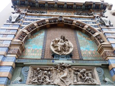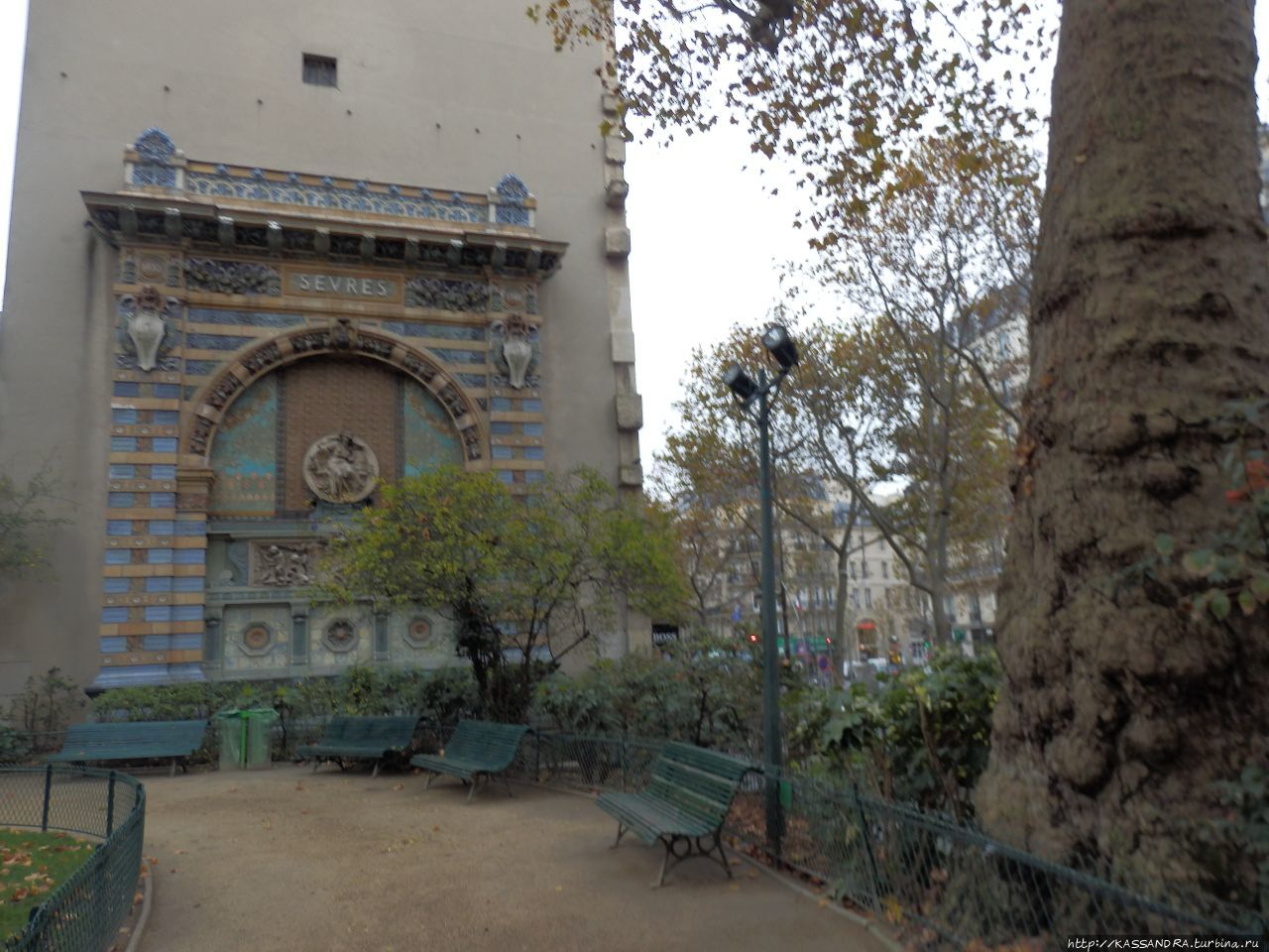 На боковой стене дома, выходящего на сквер всем известное керамическое панно Севрской фабрики в стиле ар-деко, созданное для всемирной выставки 1900 года.