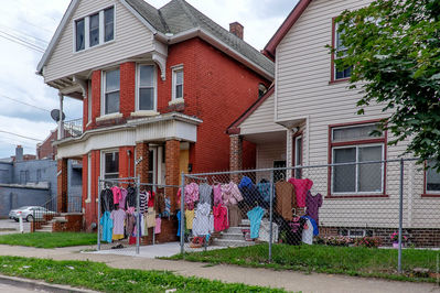 14. Соседство в Детройте. Домик справа явно никогда не оставляли. Поставили решетки, огородились заборчиком и так и живут. В мертвом, но зато родном районе.