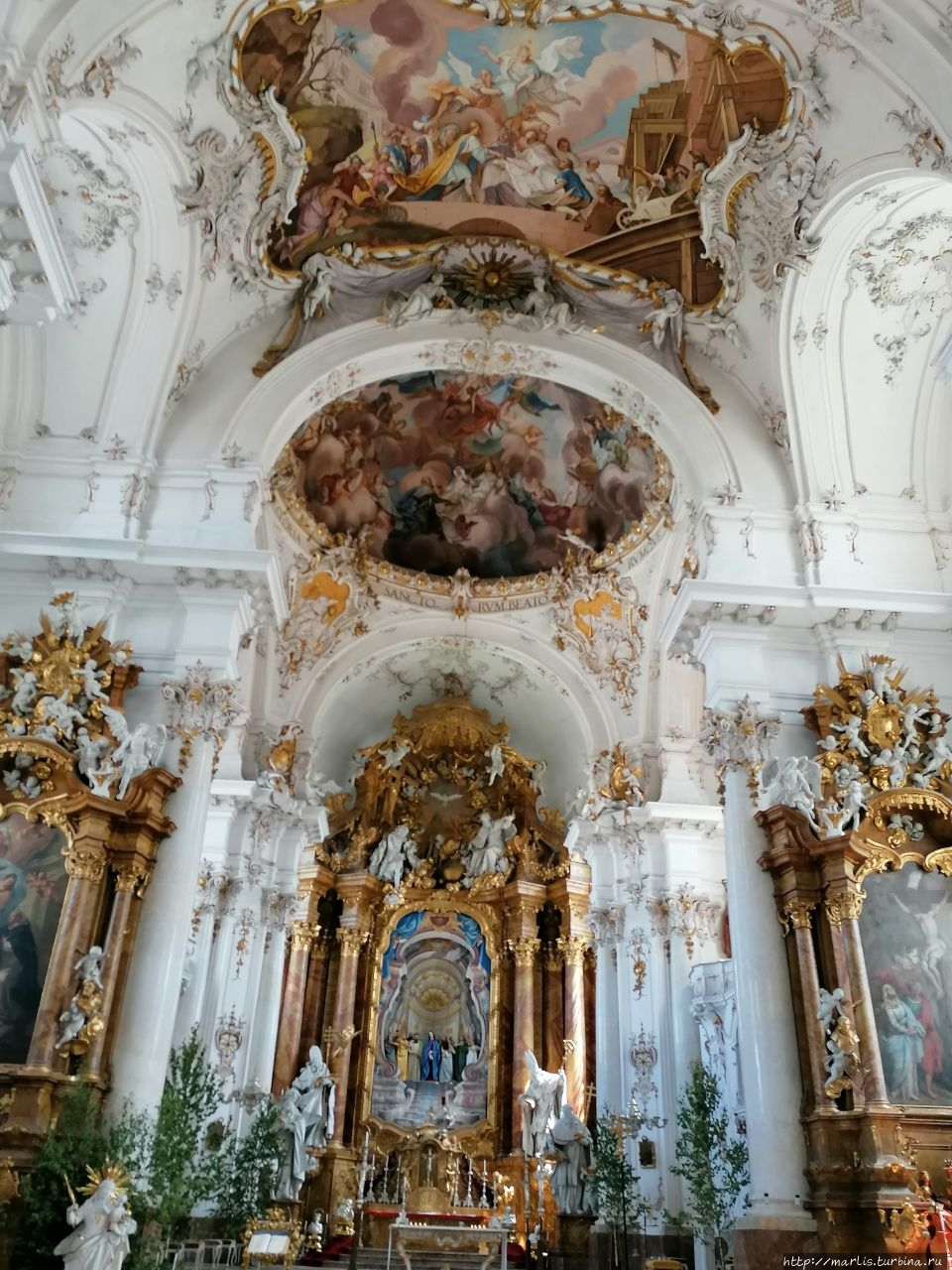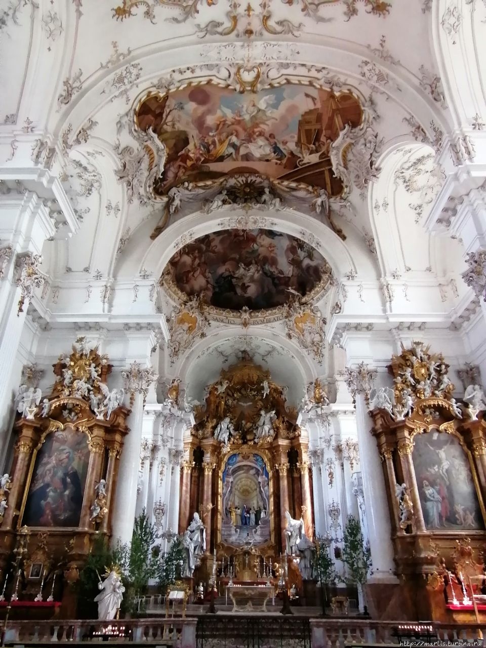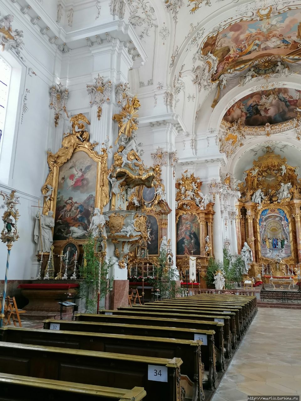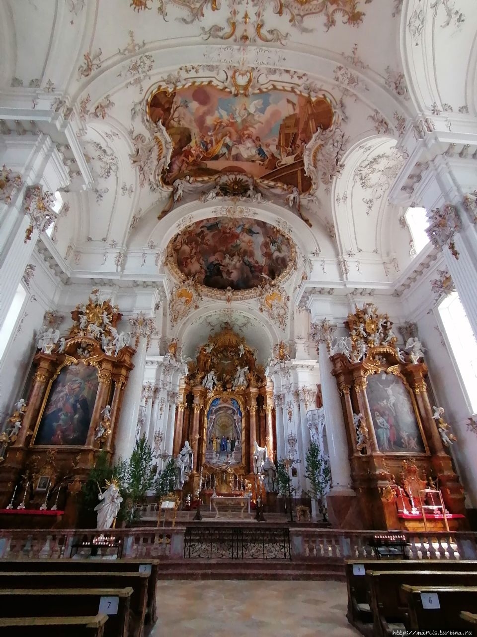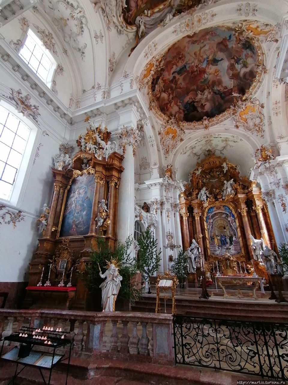 Внутренней отделкой храма занимались мастера Вессобрунской школы, в том числе братья Файхтмаер.